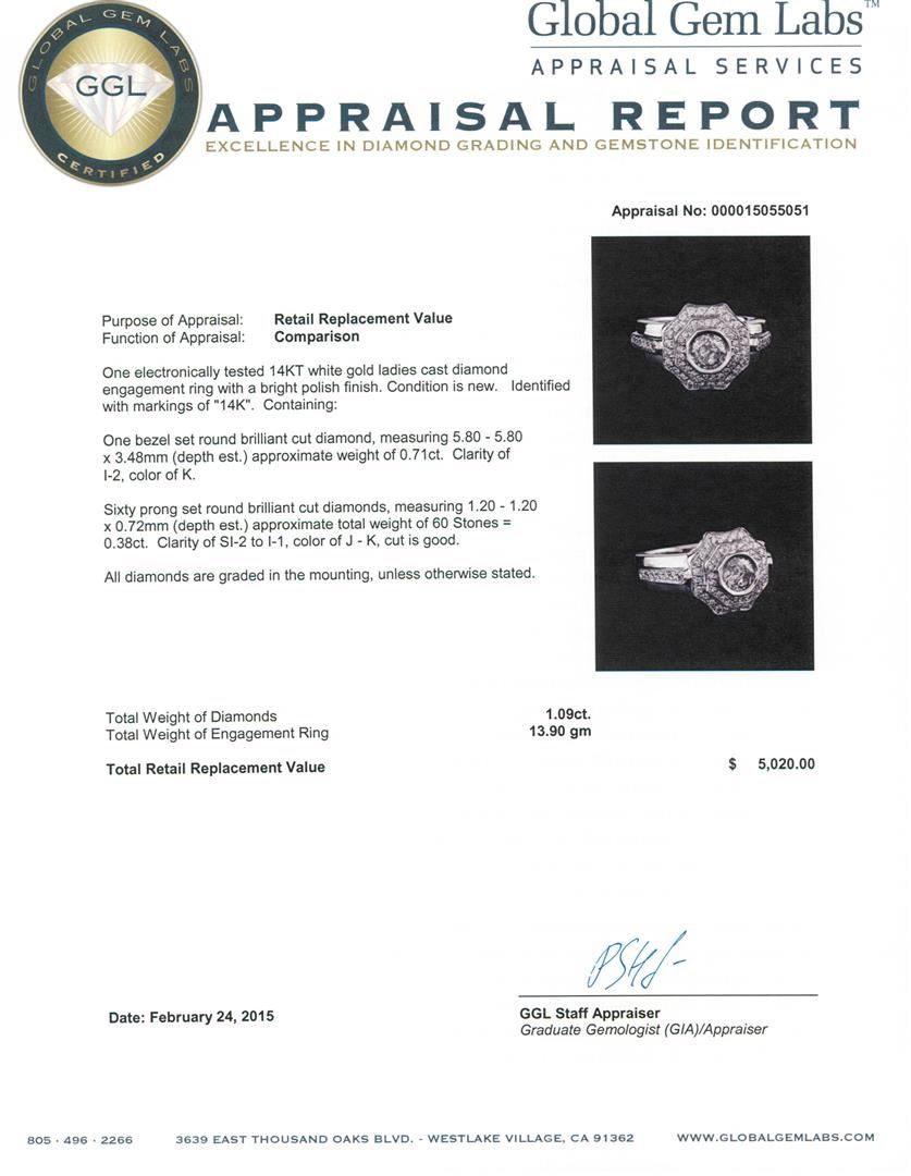 One electronically tested 14KT white gold ladies cast diamond engagement ring with a bright polish finish. Identified with markings of "14K". Condition is new. Containing: One bezel set round brilliant cut diamond, measuring 5.80 - 5.80 x 3.48mm (depth est.) approximate weight of 0.71ct. Clarity: I-2. Color: K. Sixty prong set round brilliant cut diamonds, measuring 1.20 - 1.20 x 0.72mm (depth est.) approximate total weight of 60 Stones = 0.38ct. Clarity: SI-2 to I-1. Color: J - K, Cut is Good. All diamonds are graded in the mounting, unless otherwise stated. Total Weight of Diamonds 1.09ct. Total Weight of Engagement Ring 13.90 grams. GGL Appraised at $5,020.00.