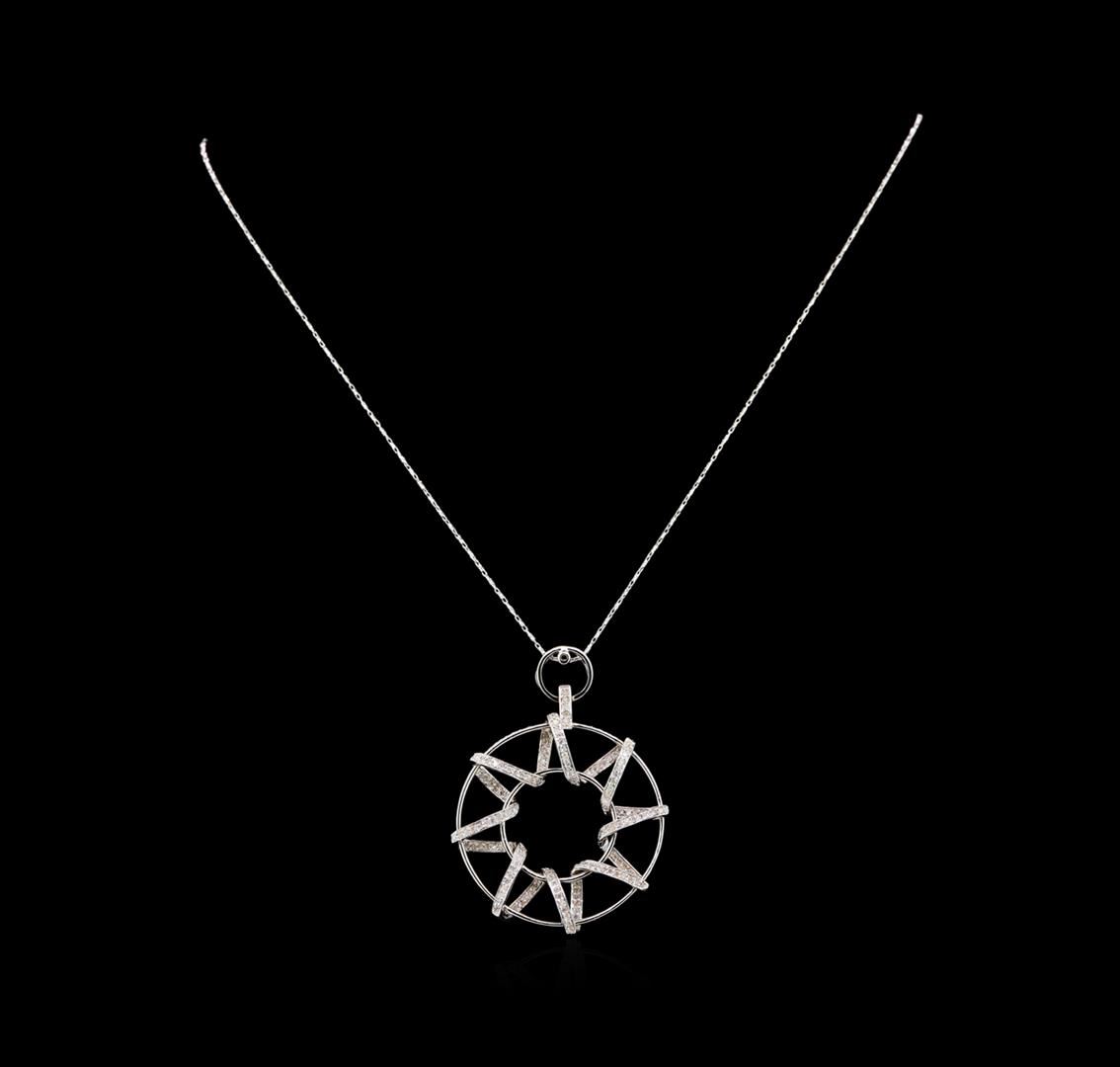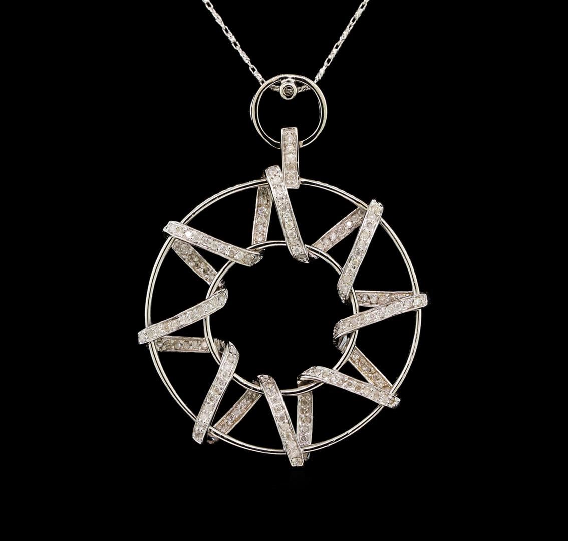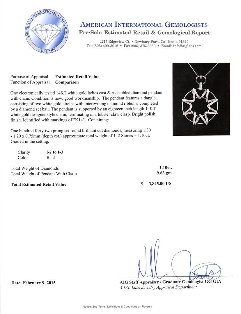 One electronically tested 14KT white gold ladies cast & assembled diamond pendant with chain. The pendant features a dangle consisting of two white gold circles with intertwining diamond ribbons, completed by a diamond set bail. The pendant is supported by an eighteen inch length 14KT white gold designer style chain, terminating in a lobster claw clasp. Bright polish finish. Identified with markings of "K14". Condition is new, good workmanship. Containing: One Hundred Forty-Two prong set round brilliant cut diamonds, measuring 1.30 - 1.20 x 0.75mm (depth est.) approximate total weight of 142 Stones = 1.10ct. Graded in the setting. Clarity: I-2 to I-3. Color: H - J. Total Weight of Diamonds 1.10ct. Total Weight of Pendant With Chain 9.63 grams. AIG Appraised at $3,845.00.