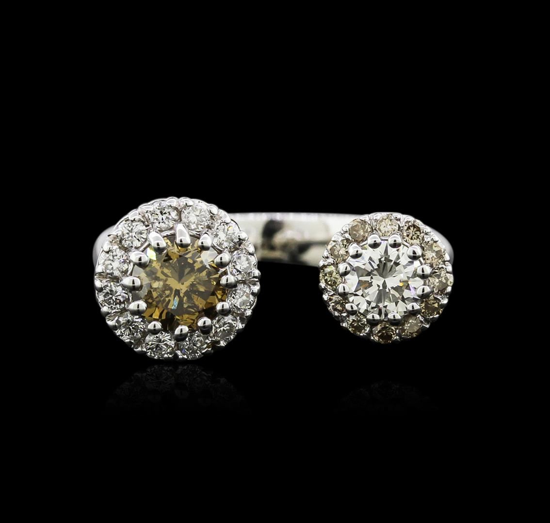 One electronically tested 14KT white gold ladies cast diamond ring with a bright polish finish. Identified with markings of "K14". Condition is new. Containing: One prong set round brilliant cut diamond, measuring 5.30 - 5.30 x 3.18mm (depth est.) approximate weight of 0.55ct. Clarity: SI-2, Cut is Good. One prong set round brilliant cut diamond, measuring 4.20 - 4.20 x 2.52mm (depth est.) approximate weight of 0.25ct. Clarity: SI-1. Color: I, Cut is Very Good. Thirteen prong set round brilliant cut diamonds, measuring 1.50 - 1.50 x 0.90mm (depth est.) approximate total weight of 13 Stones = 0.16ct. Clarity: SI-1. Color: H - I, Cut is Good. Twelve prong set round brilliant cut diamonds, measuring 1.50 - 1.50 x 0.90mm (depth est.) approximate total weight of 12 Stones = 0.14ct. Clarity: SI-2 to I-1, Cut is Good. Diamonds are graded in the mounting, unless otherwise stated. Total Weight of Diamonds 1.10ct. Total Weight of Ring 4.10 grams. GGL Appraised at $2,915.00.
