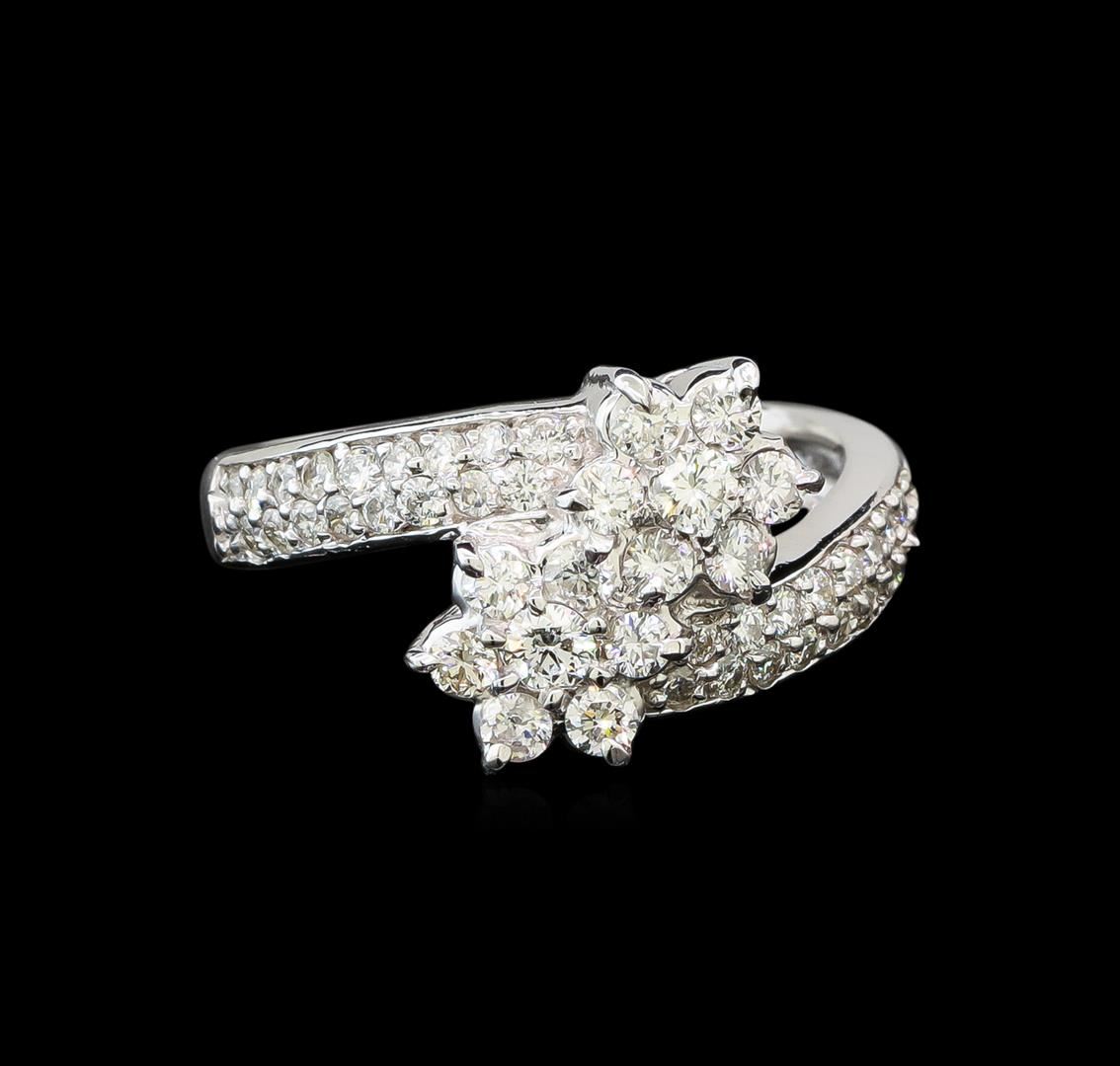 One electronically tested 14KT white gold ladies cast diamond ring with a bright polish finish. Identified with markings of "14K". Condition is new. Containing: Fifty prong set round brilliant cut diamonds, measuring 2.50 - 1.50 x 1.20mm (depth est.) approximate total weight of 50 Stones = 1.10ct. Clarity: SI-1 to I-1. Color: I - J, Cut is Good. All diamonds are graded in the mounting, unless otherwise stated. Total Weight of Diamonds 1.10ct. Total Weight of Ring 5.00 grams. GGL Appraised at $3,540.00.