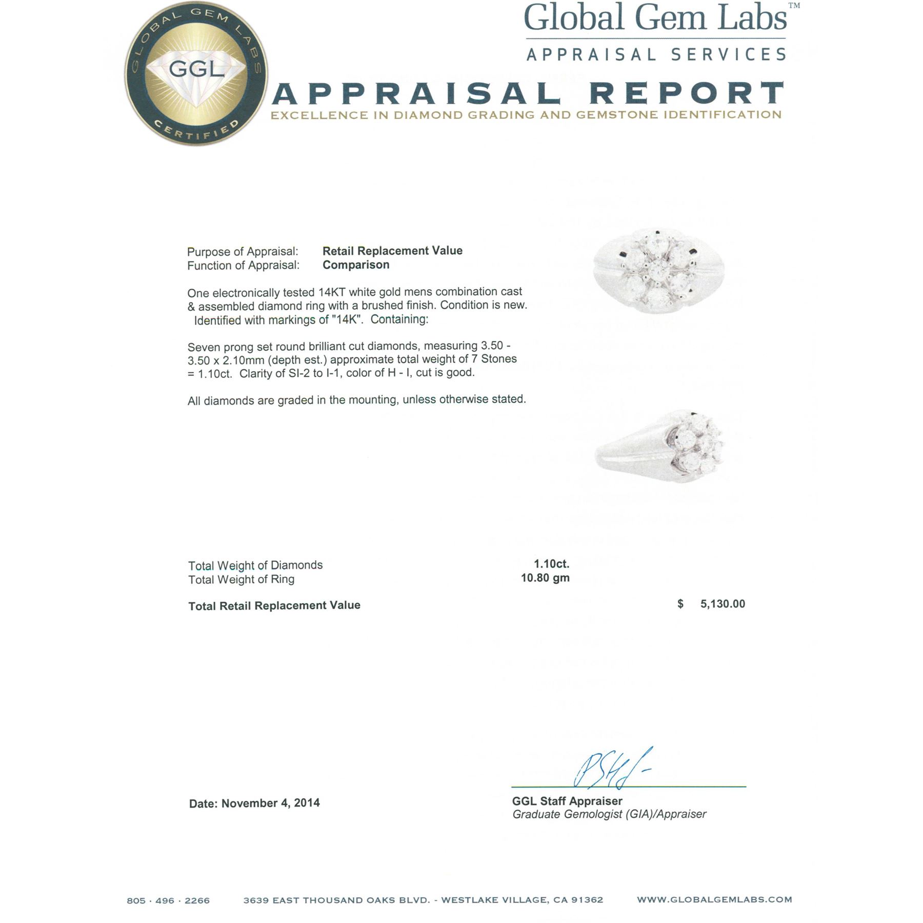 One electronically tested 14KT white gold mens combination cast & assembled diamond ring with a brushed finish. Identified with markings of "14K". Condition is new. Containing: Seven prong set round brilliant cut diamonds, measuring 3.50 - 3.50 x 2.10mm (depth est.) approximate total weight of 7 Stones = 1.10ct. Clarity: SI-2 to I-1. Color: H - I, Cut is Good. All diamonds are graded in the mounting, unless otherwise stated. Total Weight of Diamonds 1.10ct. Total Weight of Ring 10.80 grams. GGL Appraised at $5,130.00.