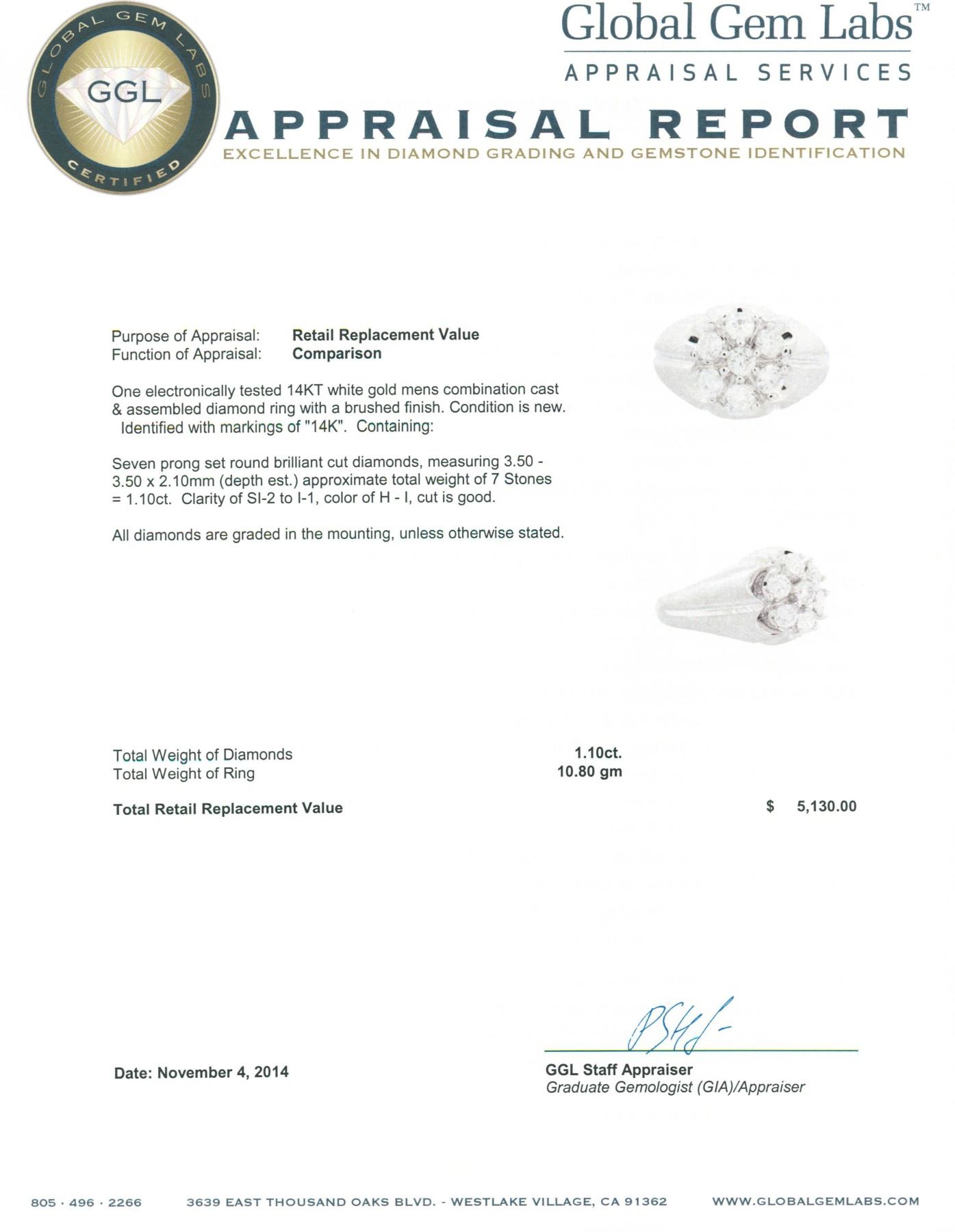 One electronically tested 14KT white gold mens combination cast & assembled diamond ring with a brushed finish. Identified with markings of "14K". Condition is new. Containing: Seven prong set round brilliant cut diamonds, measuring 3.50 - 3.50 x 2.10mm (depth est.) approximate total weight of 7 Stones = 1.10ct. Clarity: SI-2 to I-1. Color: H - I, Cut is Good. All diamonds are graded in the mounting, unless otherwise stated. Total Weight of Diamonds 1.10ct. Total Weight of Ring 10.80 grams. GGL Appraised.