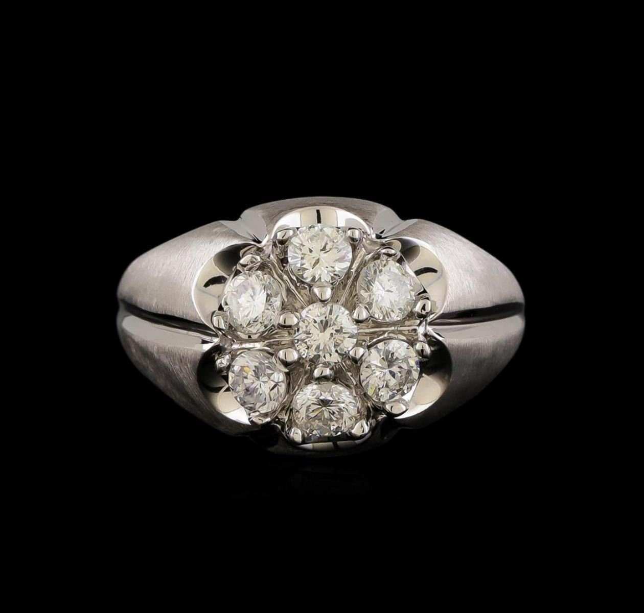 One electronically tested 14KT white gold mens combination cast & assembled diamond ring with a brushed finish. Identified with markings of "14K". Condition is new. Containing: Seven prong set round brilliant cut diamonds, measuring 3.50 - 3.50 x 2.10mm (depth est.) approximate total weight of 7 Stones = 1.10ct. Clarity: SI-2 to I-1. Color: H - I, Cut is Good. All diamonds are graded in the mounting, unless otherwise stated. Total Weight of Diamonds 1.10ct. Total Weight of Ring 10.80 grams. GGL Appraised.