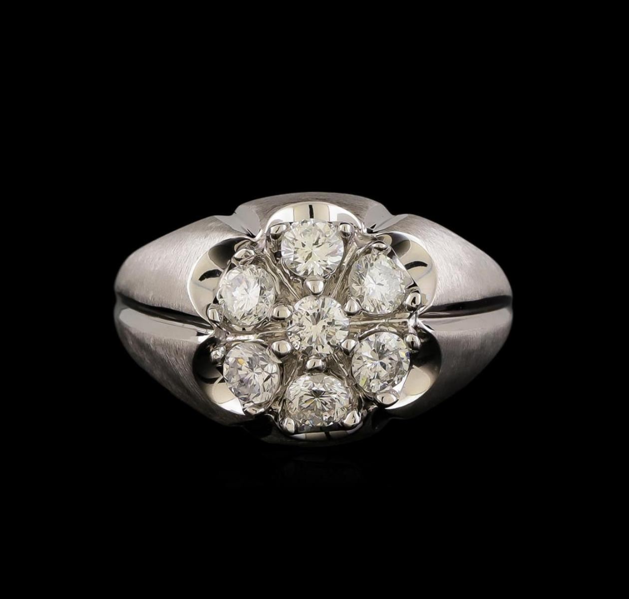 One electronically tested 14KT white gold mens combination cast & assembled diamond ring with a brushed finish. Identified with markings of "14K". Condition is new. Containing: Seven prong set round brilliant cut diamonds, measuring 3.50 - 3.50 x 2.10mm (depth est.) approximate total weight of 7 Stones = 1.10 ct. Clarity: SI-2 to I-1. Color: H - I, Cut is Good. All diamonds are graded in the mounting, unless otherwise stated. Total Weight of Diamonds 1.10 ct. Total Weight of Ring 10.80 grams. GGL Appraised.