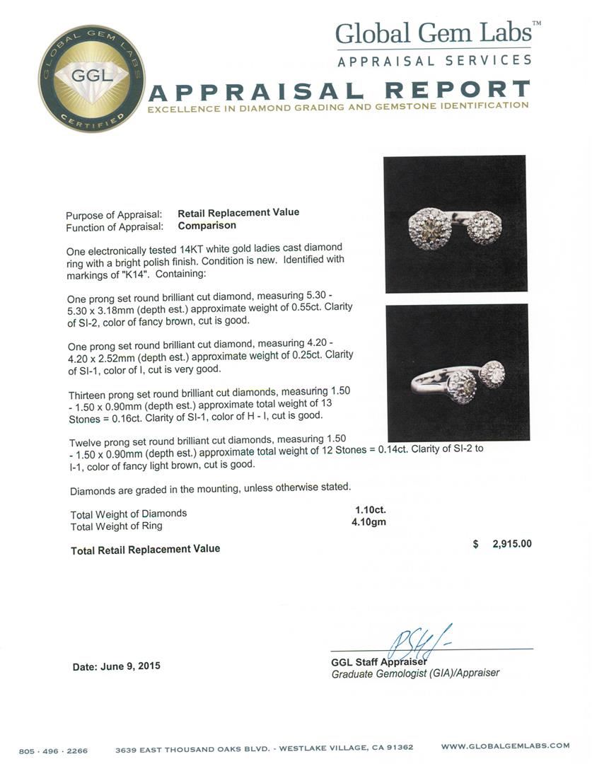 One electronically tested 14KT white gold ladies cast diamond ring with a bright polish finish. Identified with markings of "K14". Condition is new. Containing: One prong set round brilliant cut diamond, measuring 5.30 - 5.30 x 3.18mm (depth est.) approximate weight of 0.55ct. Clarity: SI-2, Cut is Good. One prong set round brilliant cut diamond, measuring 4.20 - 4.20 x 2.52mm (depth est.) approximate weight of 0.25ct. Clarity: SI-1. Color: I, Cut is Very Good. Thirteen prong set round brilliant cut diamonds, measuring 1.50 - 1.50 x 0.90mm (depth est.) approximate total weight of 13 Stones = 0.16ct. Clarity: SI-1. Color: H - I, Cut is Good. Twelve prong set round brilliant cut diamonds, measuring 1.50 - 1.50 x 0.90mm (depth est.) approximate total weight of 12 Stones = 0.14ct. Clarity: SI-2 to I-1, Cut is Good. Diamonds are graded in the mounting, unless otherwise stated. Total Weight of Diamonds 1.10 ct. Total Weight of Ring 4.10 grams. GGL Appraised.