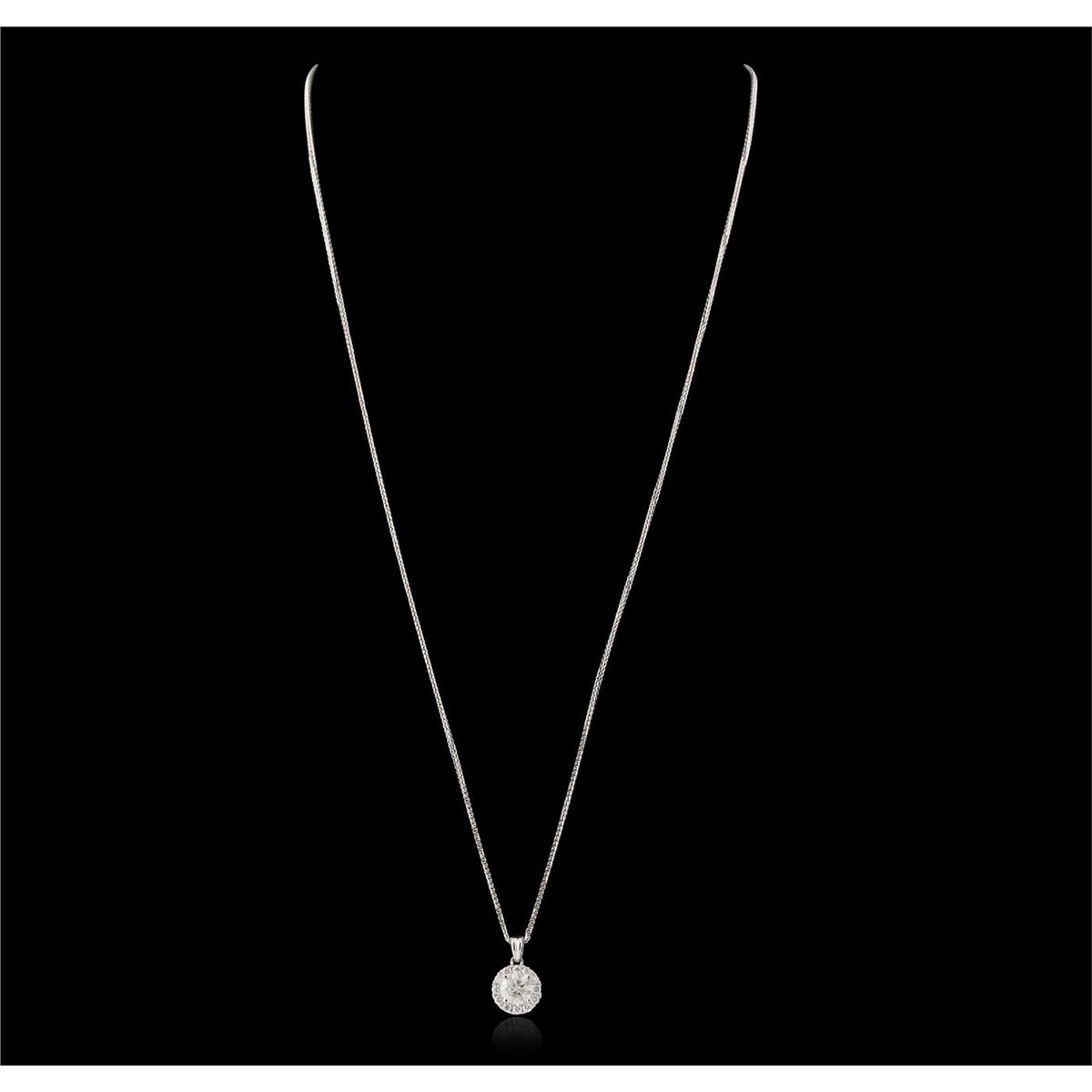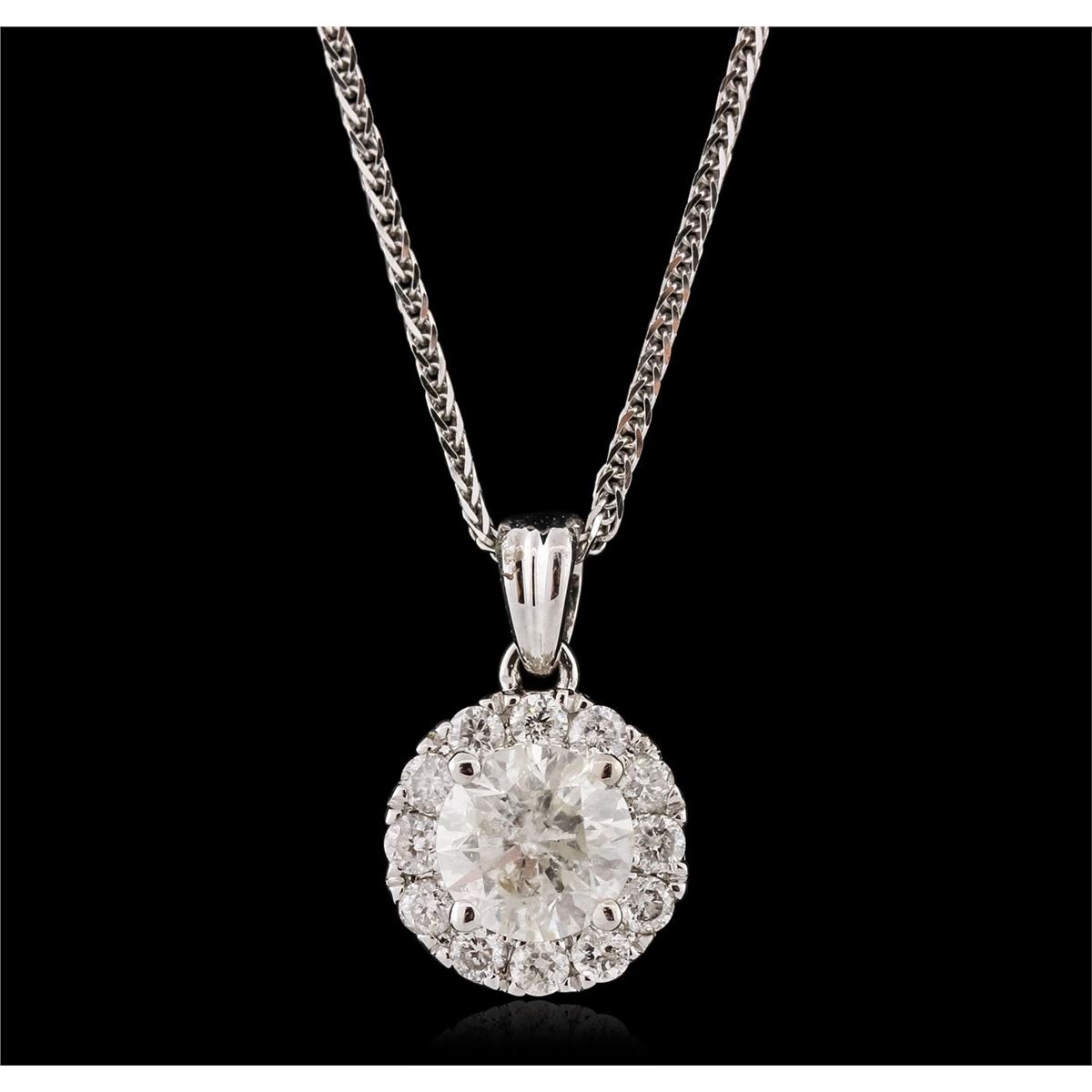 One electronically tested 14KT white gold ladies combination cast & assembled diamond pendant & chain 18.0" long, medium fancy cable with a lobster claw clasp with a bright polish finish. Identified with markings of "14K". Condition is new. Containing: One prong set round brilliant cut diamond, measuring 5.94 - 5.91 x 3.93mm (depth est.) approximate weight of 0.84ct. Clarity: I-2. Color: J, Cut is Good. Twelve prong set round brilliant cut diamonds, measuring 1.80 - 1.80 x 1.08mm (depth est.) approximate total weight of 12 Stones = 0.26ct. Clarity: SI-2 to I-2. Color: H - J, Cut is Good. All diamonds are graded in the mounting, unless otherwise stated. Total Weight of Diamonds 1.10ct. Total Weight of Pendant & Chain 2.70 grams. GGL Appraised at $5,020.00.