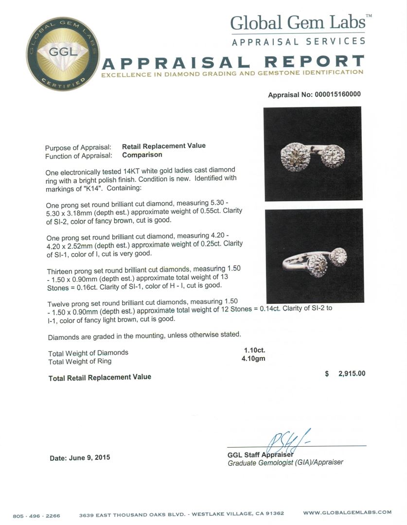 One electronically tested 14KT white gold ladies cast diamond ring with a bright polish finish. Identified with markings of "K14". Condition is new. Containing: One prong set round brilliant cut diamond, measuring 5.30 - 5.30 x 3.18mm (depth est.) approximate weight of 0.55ct. Clarity: SI-2, Cut is Good. One prong set round brilliant cut diamond, measuring 4.20 - 4.20 x 2.52mm (depth est.) approximate weight of 0.25ct. Clarity: SI-1. Color: I, Cut is Very Good. Thirteen prong set round brilliant cut diamonds, measuring 1.50 - 1.50 x 0.90mm (depth est.) approximate total weight of 13 Stones = 0.16ct. Clarity: SI-1. Color: H - I, Cut is Good. Twelve prong set round brilliant cut diamonds, measuring 1.50 - 1.50 x 0.90mm (depth est.) approximate total weight of 12 Stones = 0.14ct. Clarity: SI-2 to I-1, Cut is Good. Diamonds are graded in the mounting, unless otherwise stated. Total Weight of Diamonds 1.10ct. Total Weight of Ring 4.10 grams. GGL Appraised at $2,915.00.