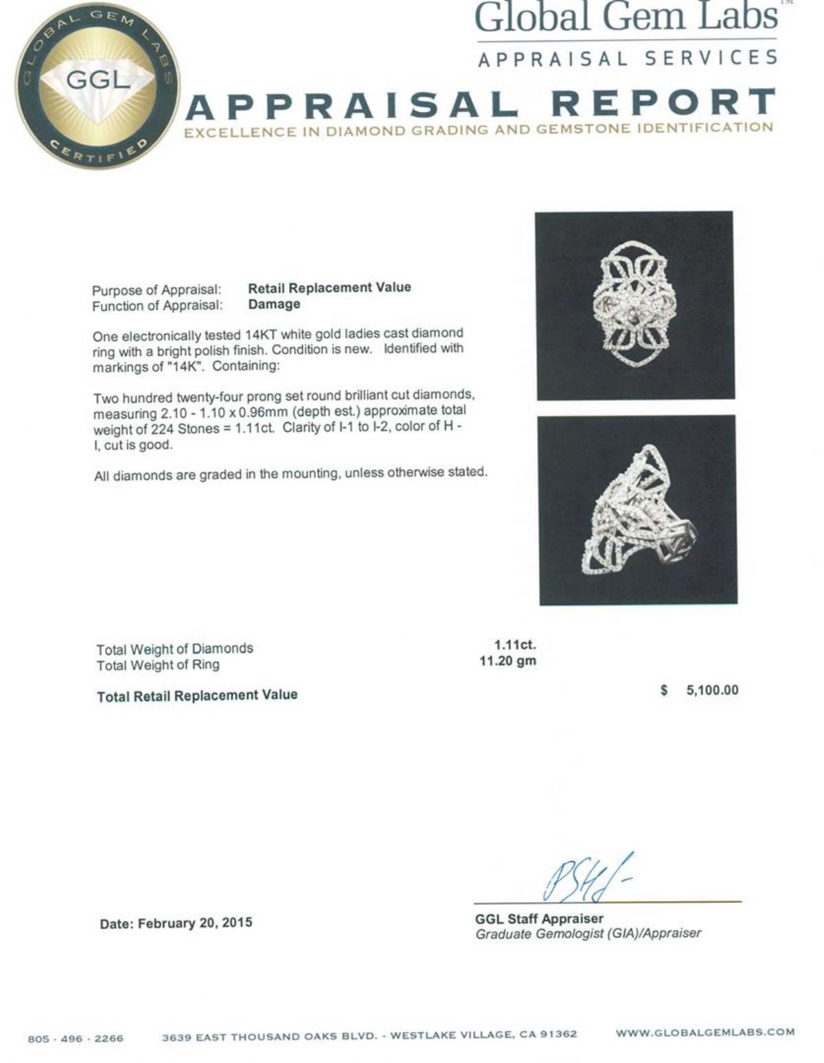 One electronically tested 14KT white gold ladies cast diamond ring with a bright polish finish. Identified with markings of "14K". Condition is new. Containing: Two Hundred Twenty-Four prong set round brilliant cut diamonds, measuring 2.10 - 1.10 x 0.96mm (depth est.) approximate total weight of 224 Stones = 1.11ct. Clarity: I-1 to I-2. Color: H - I, Cut is Good. All diamonds are graded in the mounting, unless otherwise stated. Total Weight of Diamonds 1.11ct. Total Weight of Ring 11.20 grams. GGL Appraised.