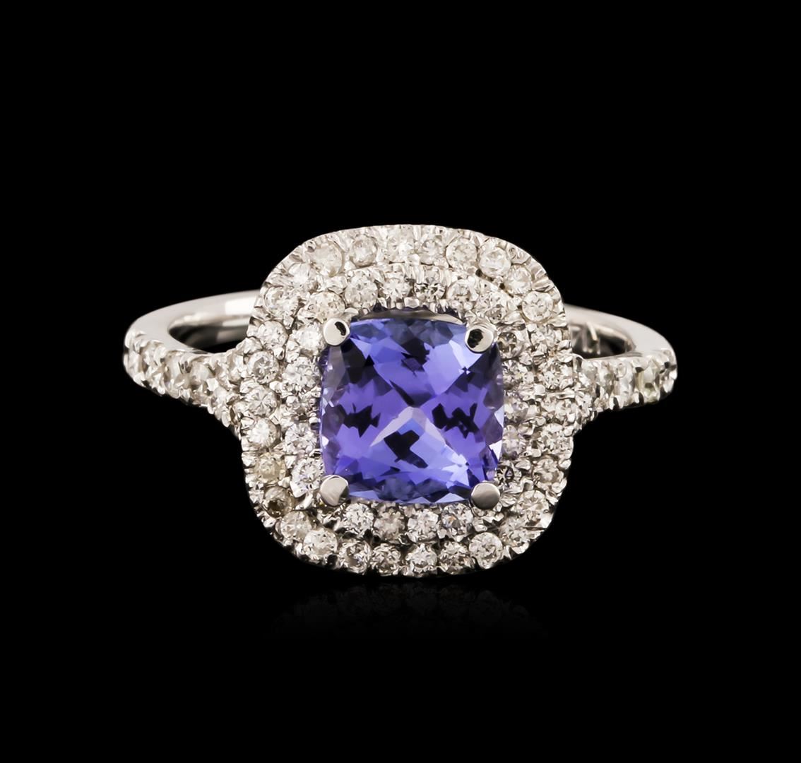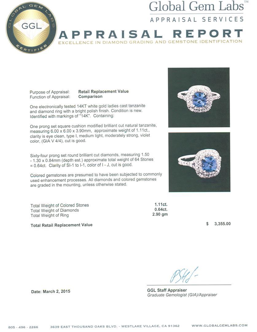 One electronically tested 14KT white gold ladies cast tanzanite and diamond ring with a bright polish finish. Identified with markings of "14K". Condition is new. Containing: One prong set square cushion modified brilliant cut natural tanzanite, measuring 6.00 x 6.00 x 3.90mm, approximate weight of 1.11ct., clarity is eye clean, type I, medium light, moderately strong, violet color, (GIA V 4/4), cut is good. Sixty-Four prong set round brilliant cut diamonds, measuring 1.50 - 1.30 x 0.84mm (depth est.) approximate total weight of 64 Stones = 0.64ct. Clarity: SI-1 to I-1. Color: I - J, Cut is Good. Colored gemstones are presumed to have been subjected to commonly used enhancement processes. All diamonds and colored gemstones are graded in the mounting, unless otherwise stated. Total Weight of Colored Stones 1.11ct. Total Weight of Diamonds 0.64ct. Total Weight of Ring 2.90 grams. GGL Appraised at $3,355.00.