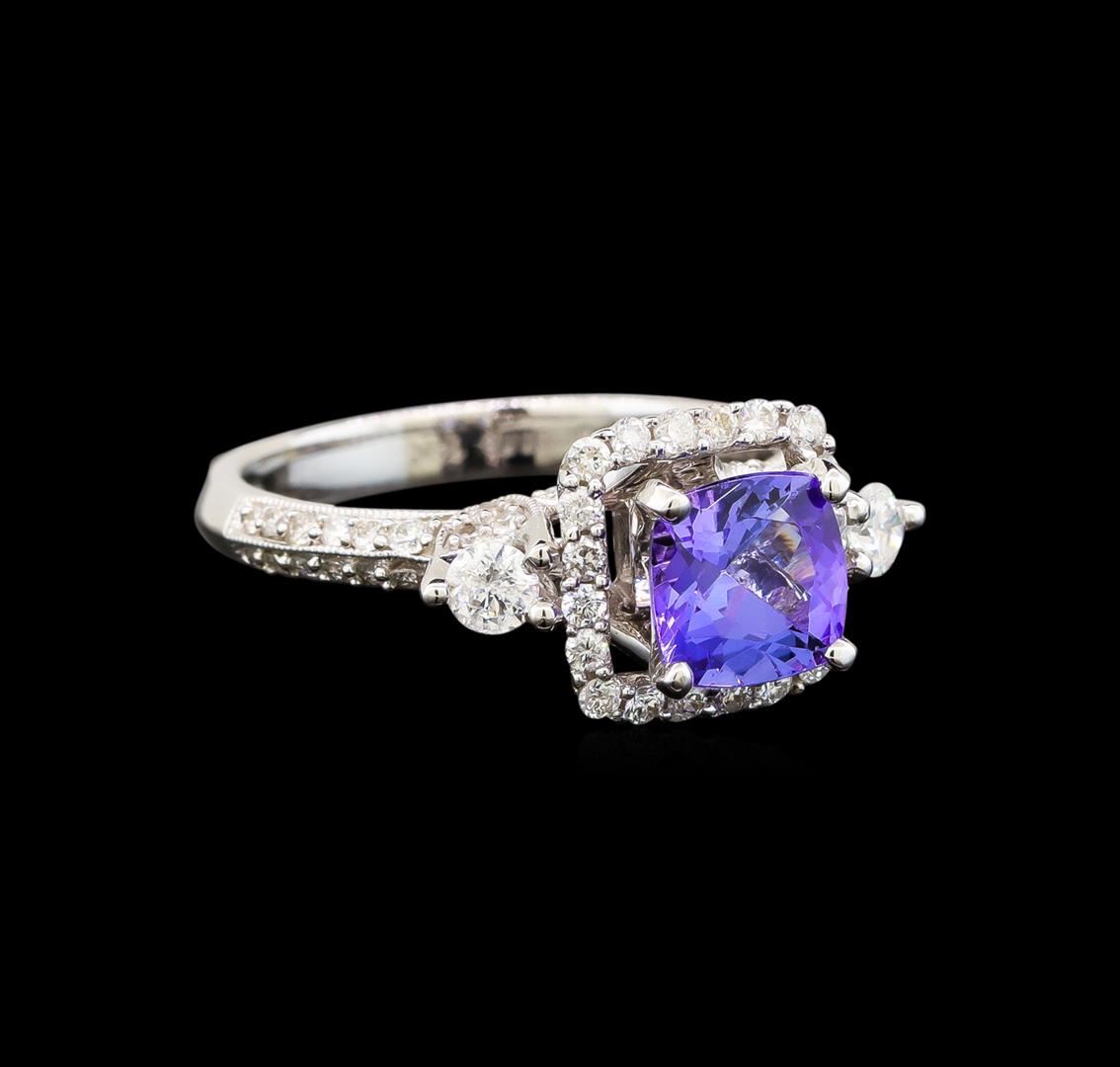 One electronically tested 14KT white gold ladies cast tanzanite and diamond ring with a flat shank with a bright polish finish. Trademark is Orianne. Identified with markings of "14K". Condition is new. Containing: One prong set square cushion modified brilliant cut natural tanzanite, measuring 6.00 x 6.00 x 3.90mm, approximate weight of 1.11ct., clarity is eye clean, type I, medium, very slightly grayish, violet color, (GIA V 5/3), cut is good. Sixty-Four prong set round brilliant cut diamonds, measuring 1.00 - 1.00 x 0.60mm (depth est.) approximate total weight of 64 Stones = 0.23ct. Clarity: SI-2 to I-1. Color: I - J, Cut is Good. Two prong set round brilliant cut diamonds, measuring 2.80 - 2.80 x 1.68mm (depth est.) approximate total weight of 2 Stones = 0.16ct. Clarity: SI-2 to I-1. Color: H - I. Colored gemstones are presumed to have been subjected to commonly used enhancement processes. All diamonds and colored gemstones are graded in the mounting, unless otherwise stated. Total Weight of Colored Stones 1.11ct. Total Weight of Diamonds 0.39ct. Total Weight of Ring 3.90 grams. GGL Appraised at $3,030.00.