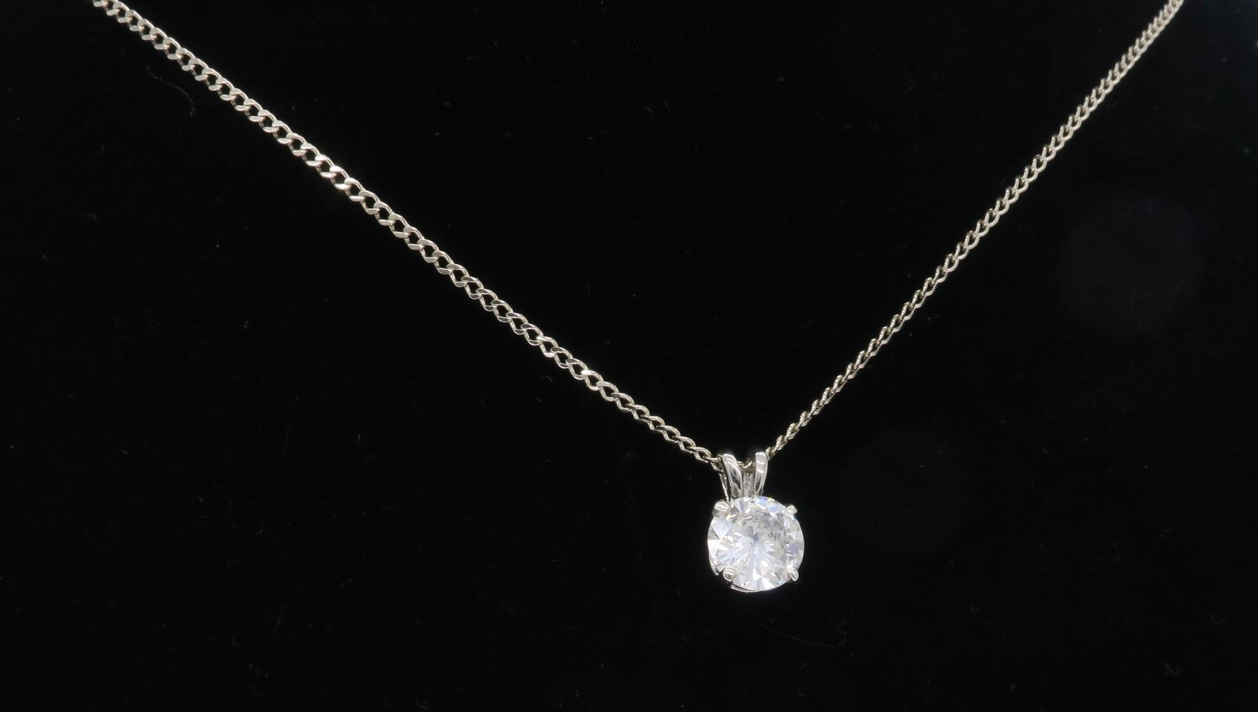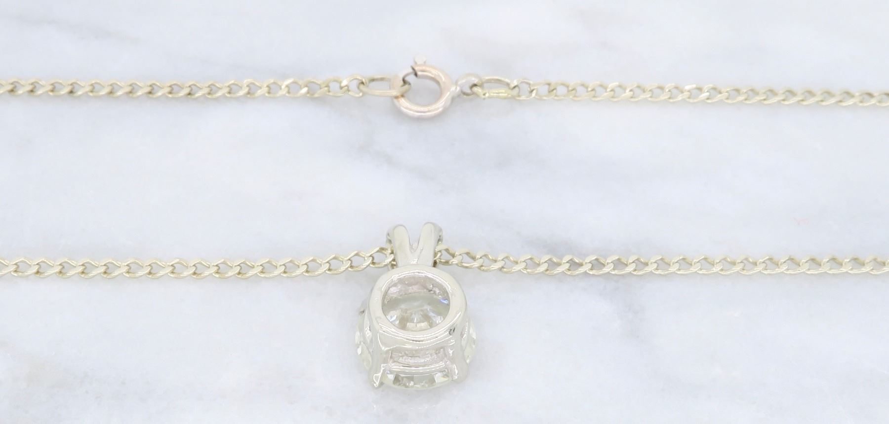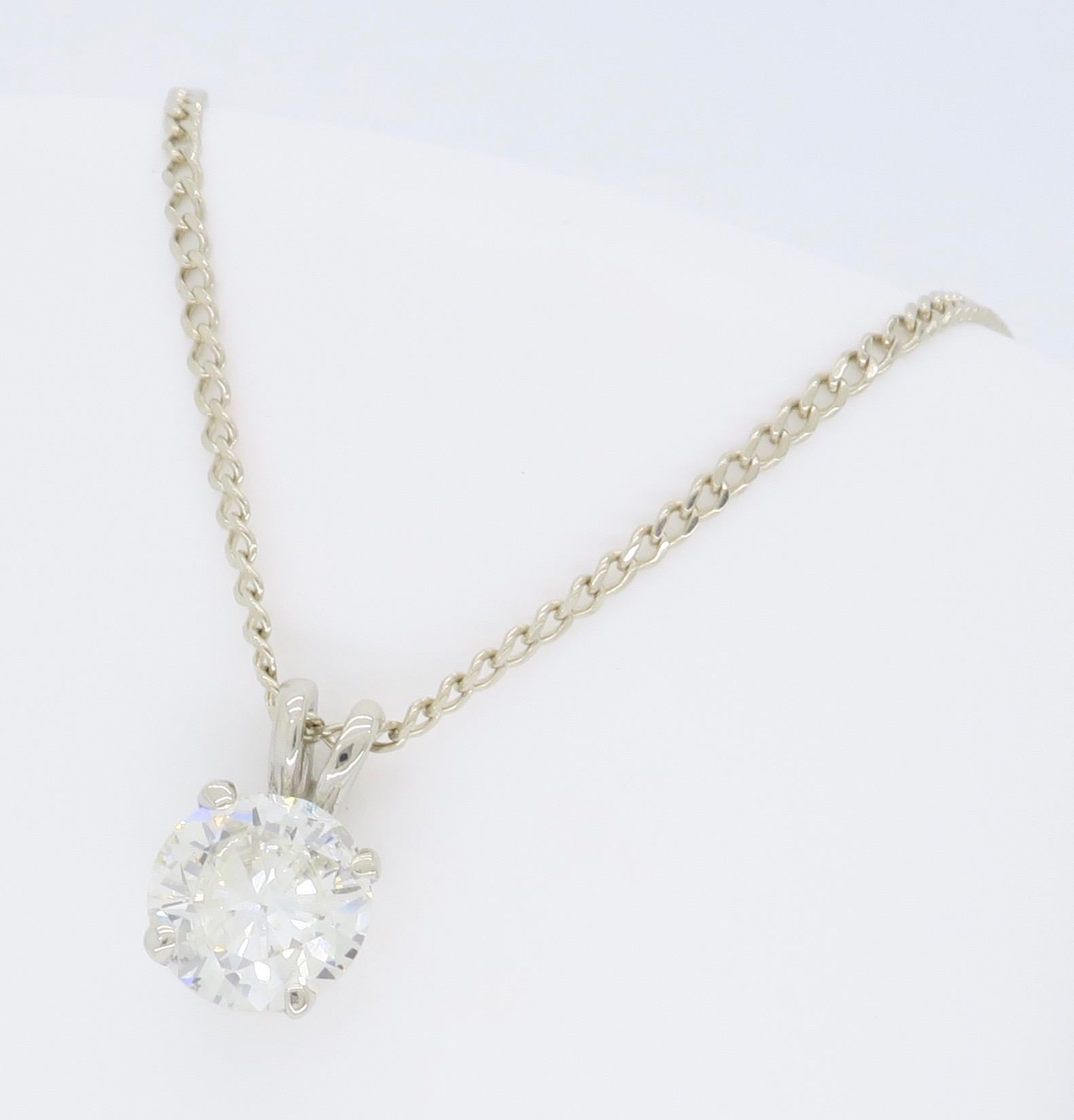 One 14KT White Gold 1.11ct Diamond Pendant with Chain. (1) Round Diamond with a total weight of 1.11cts with a color of J-K and clarity of I-1. Total weight of this pendant with chain is 3.2 grams. Length of this chain is 19 inches.