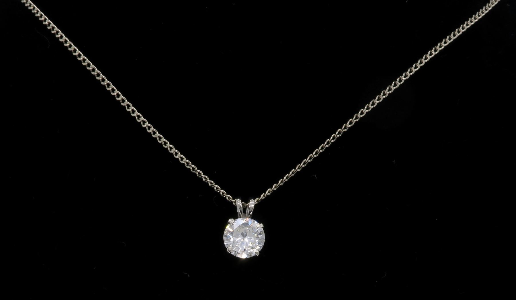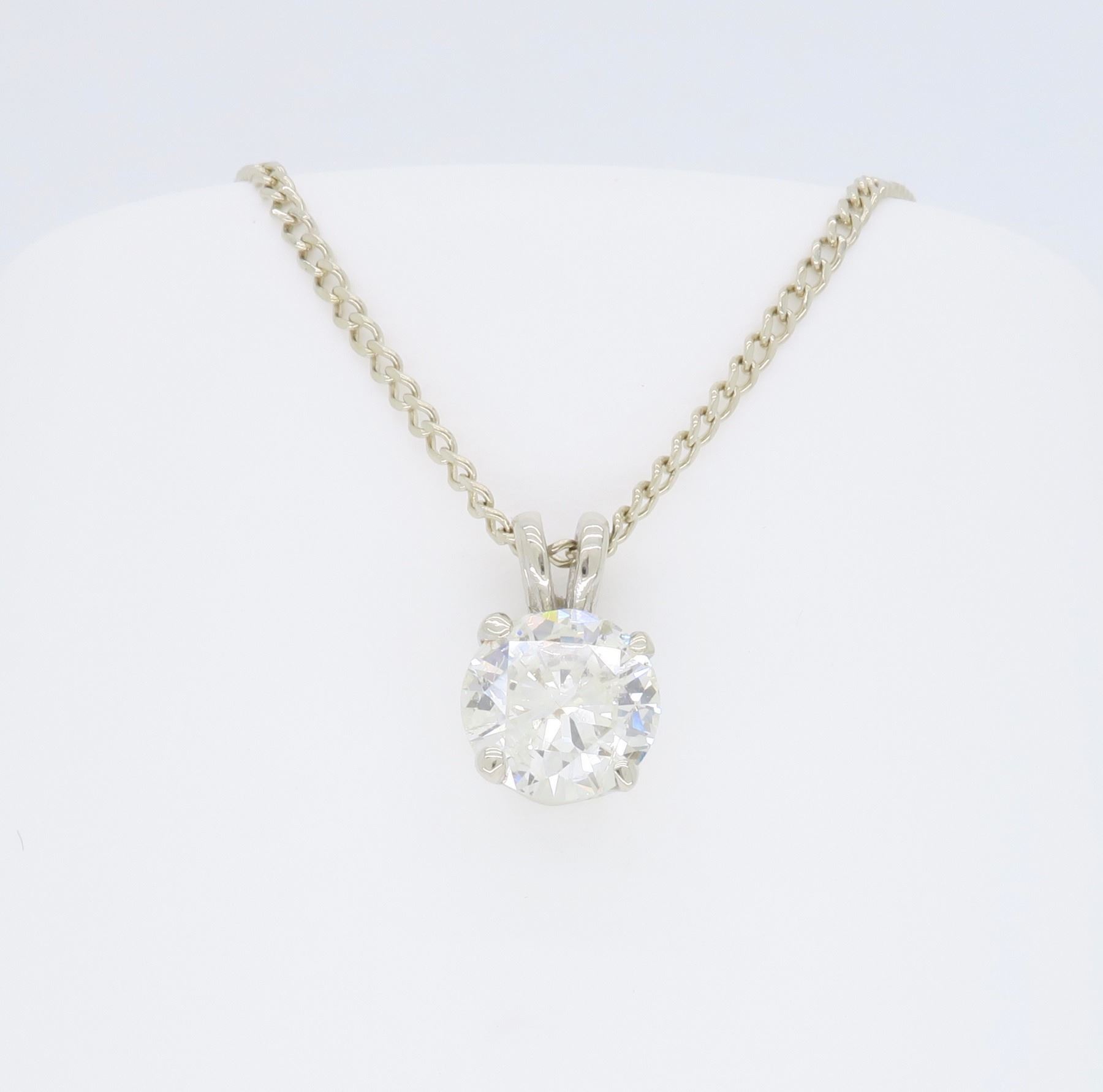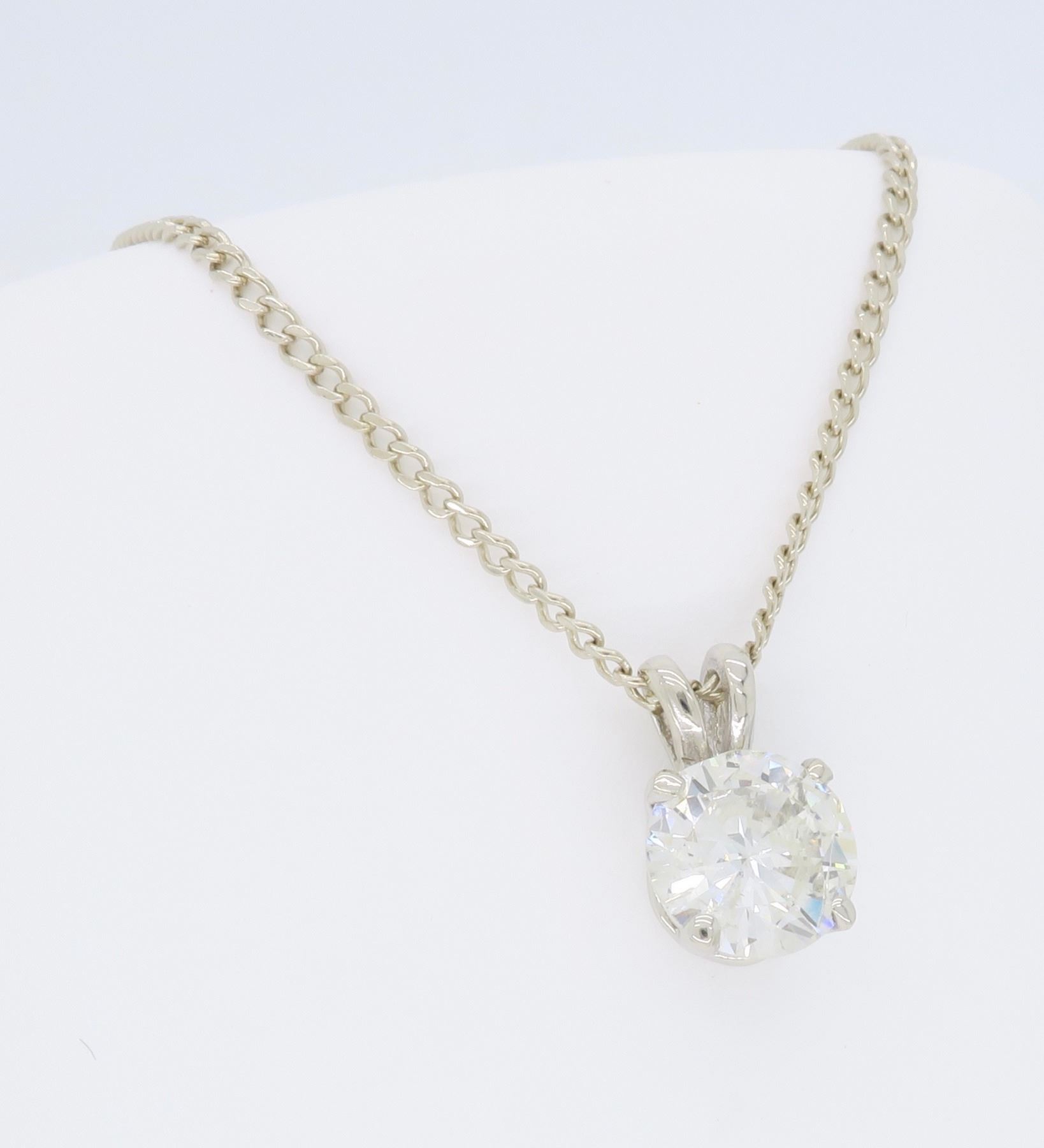 One 14KT White Gold 1.11ct Diamond Pendant with Chain. (1) Round Diamond with a total weight of 1.11cts with a color of J-K and clarity of I-1. Total weight of this pendant with chain is 3.2 grams. Length of this chain is 19 inches.