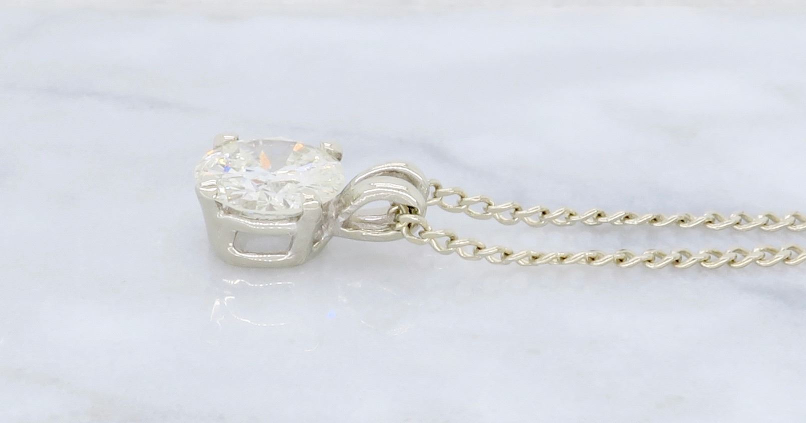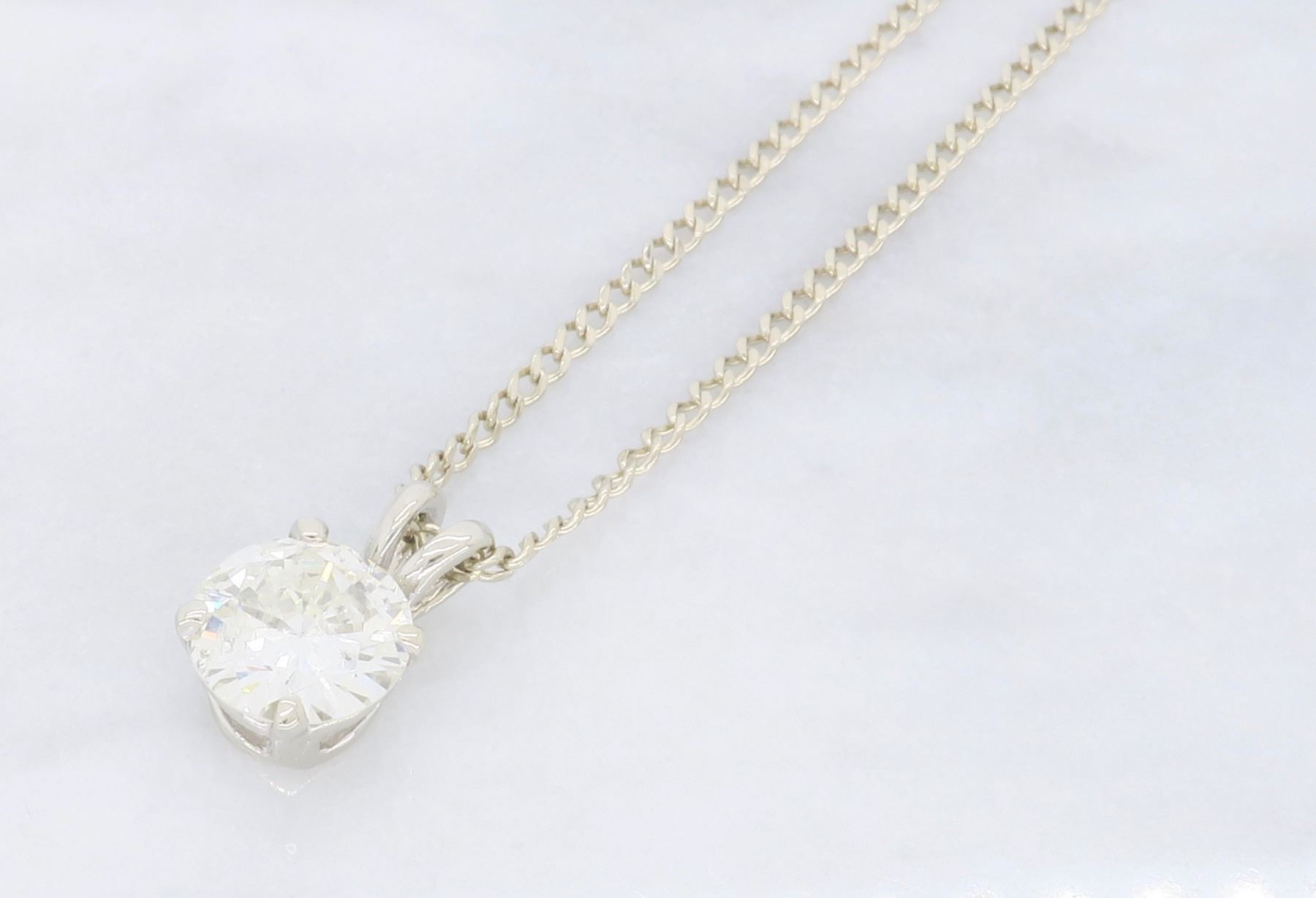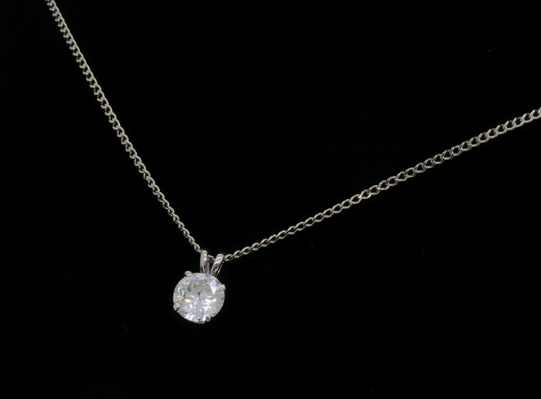 One 14KT White Gold 1.11ct Diamond Pendant with Chain. (1) Round Diamond with a total weight of 1.11cts with a color of J-K and clarity of I-1. Total weight of this pendant with chain is 3.2 grams. Length of this chain is 19 inches.