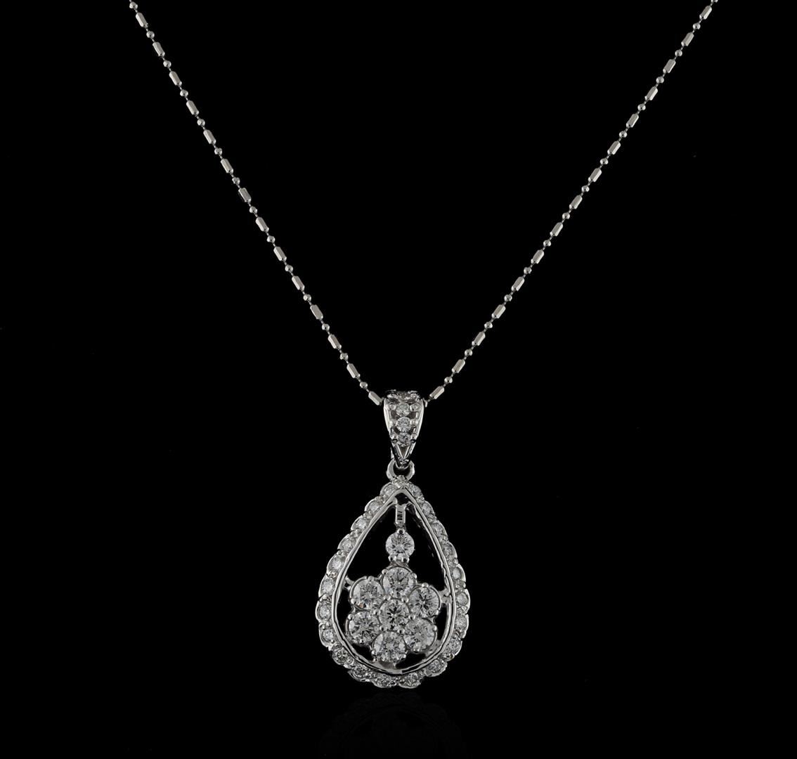 One electronically tested 14KT white gold ladies cast diamond pendant & chain 18.0" long, with a spring ring clasp with a bright polish finish. Identified with markings of "14K". Condition is new. Containing: Eight prong set round brilliant cut diamonds, measuring 2.90 - 2.80 x 1.71mm (depth est.) approximate total weight of 8 Stones = 0.75ct. Clarity: SI-1 to SI-2. Color: H - I, Cut is Good. Thirty prong set round brilliant cut diamonds, measuring 1.40 - 1.40 x 0.84mm (depth est.) approximate total weight of 30 Stones = 0.36ct. Clarity: SI-1 to I-1. Color: I - J, Cut is Good. All diamonds are graded in the mounting, unless otherwise stated. Total Weight of Diamonds 1.11ct. Total Weight of Pendant & Chain 5.40 grams. GGL Appraised at $2,795.00.