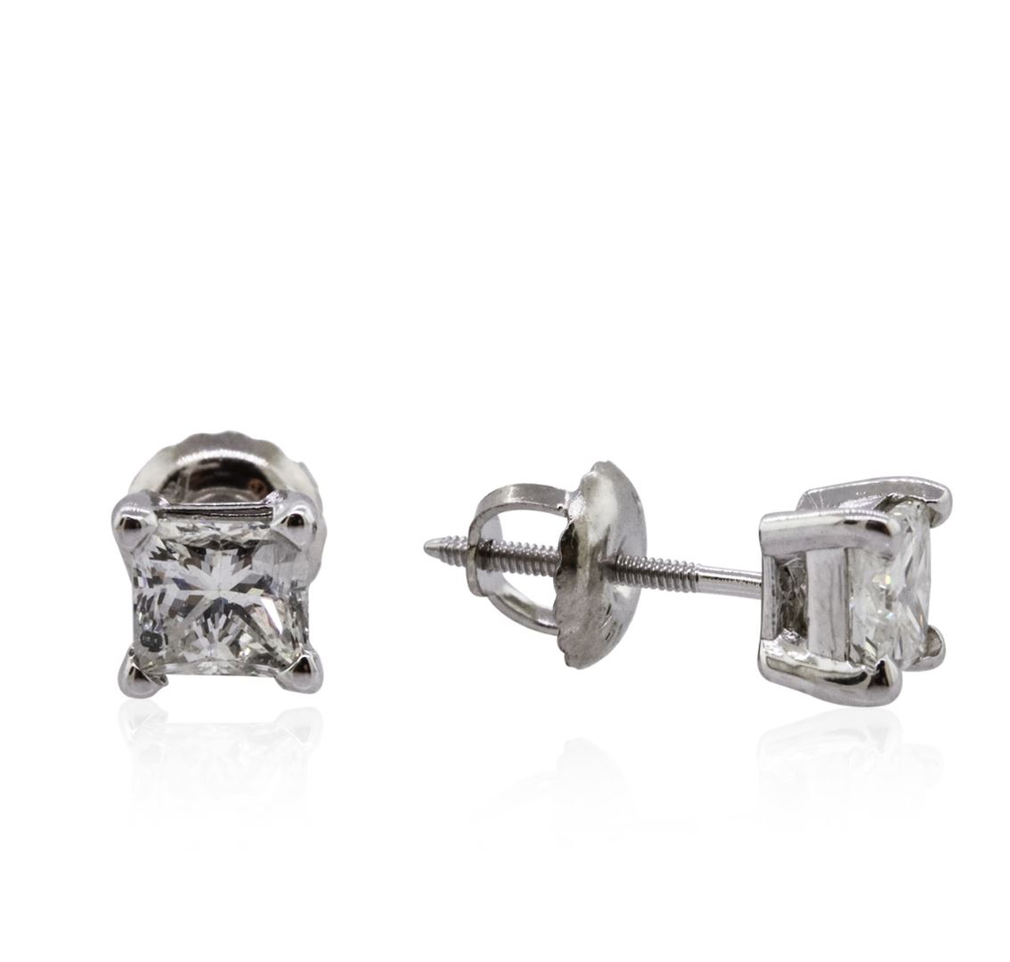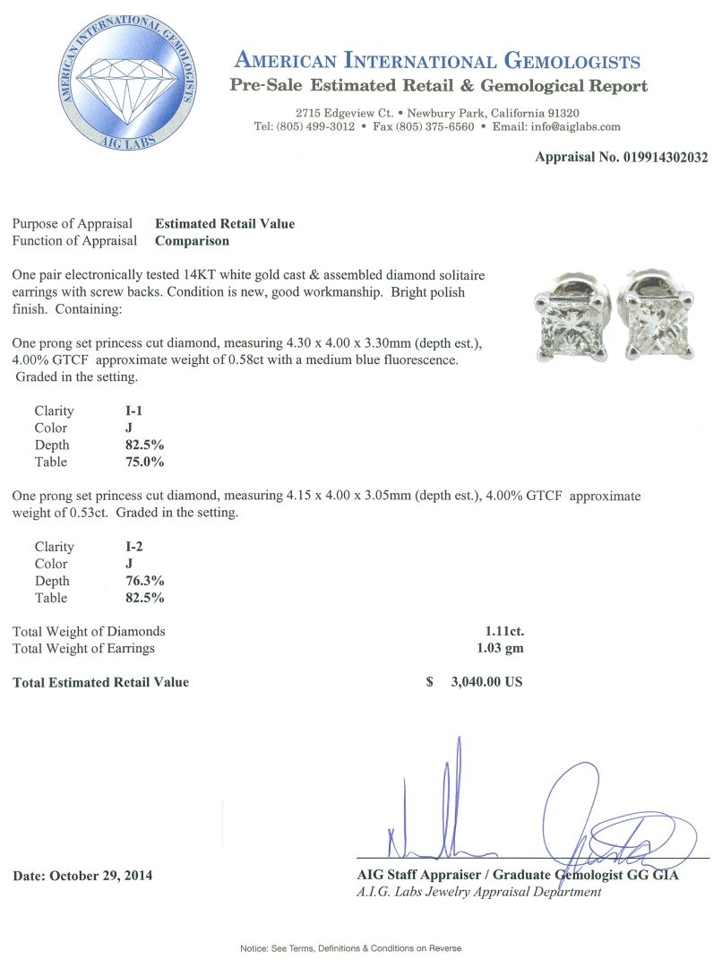 One pair electronically tested 14KT white gold cast & assembled diamond solitaire earrings with screw backs. Bright polish finish. Condition is new, good workmanship. Containing: One prong set princess cut diamond, measuring 4.30 x 4.00 x 3.30mm (depth est.), 4.00.%. GTCF approximate weight of 0.58ct with a medium blue fluorescence. Graded in the setting. Clarity: I-1. Color: 82.5%. Table 75.0%. One prong set princess cut diamond, measuring 4.15 x 4.00 x 3.05mm (depth est.), 4.00.%. GTCF approximate weight of 0.53ct. Graded in the setting. Clarity: I-2. Color: 76.3%. Table 82.5%. Total Weight of Diamonds 1.11ct. Total Weight of Earrings 1.03 grams. AIG Appraised at $3,040.00.