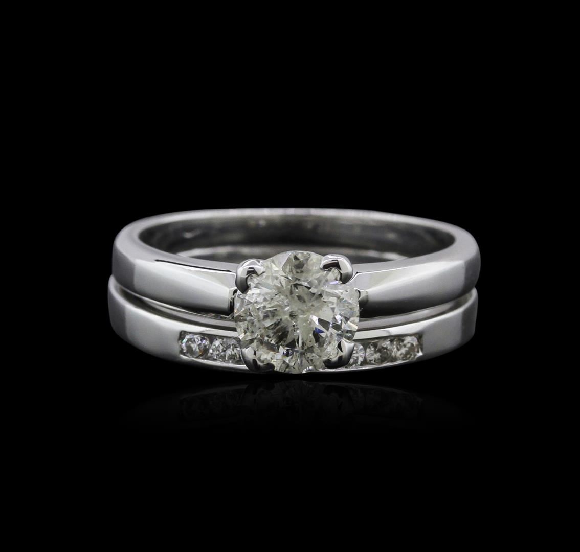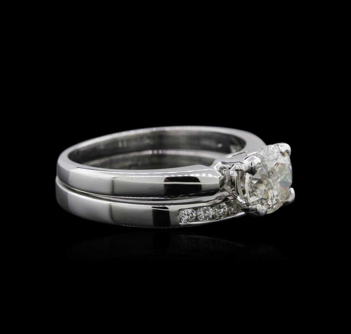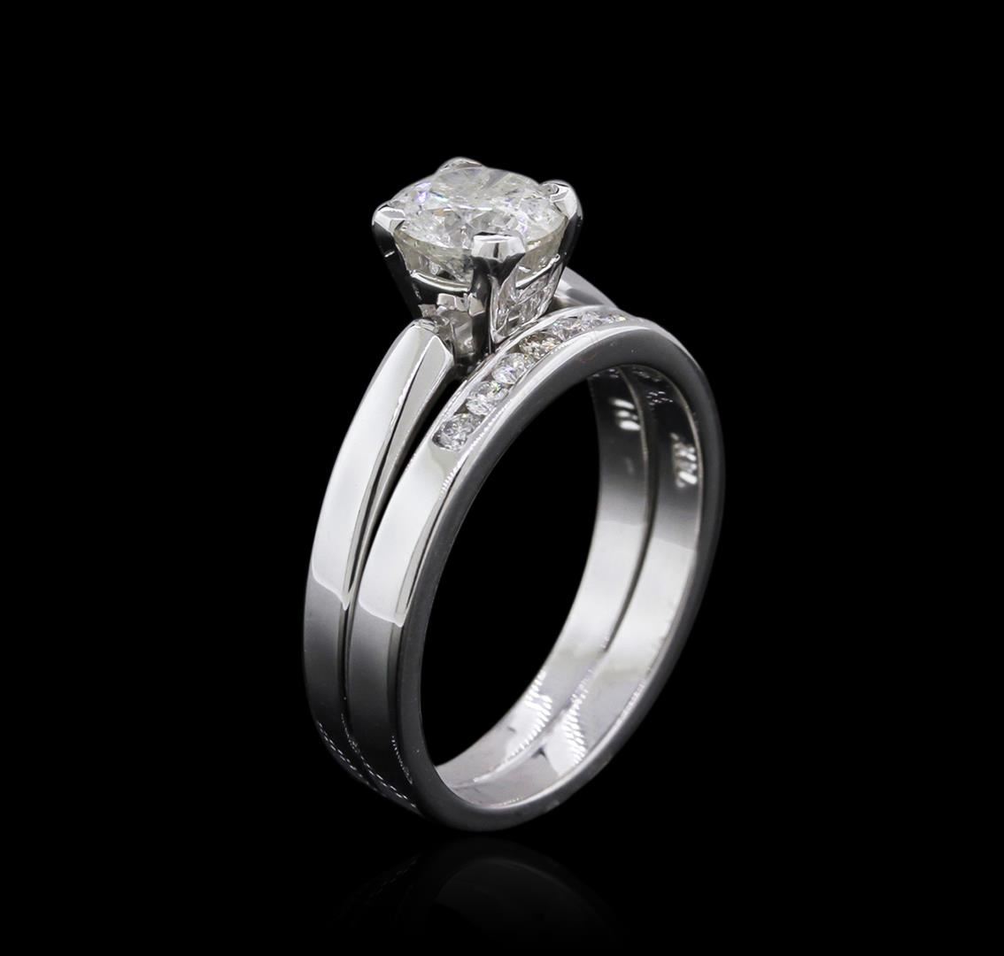 One electronically tested 14KT white gold ladies cast diamond engagement ring with a bright polish finish. Identified with markings of "14K". Condition is new. Containing: One prong set round brilliant cut diamond, measuring 6.45 - 6.45 x 4.00mm (depth est.) approximate weight of 1.02ct. Clarity: I-2. Color: J, Cut is Good. Eight channel set round brilliant cut diamonds, measuring 1.60 - 1.50 x 0.93mm (depth est.) approximate. Total Weight of 8 Stones = 0.11ct. Clarity: SI-1 to I-1. Color: I - J, Cut is Good. All diamonds are graded in the mounting, unless otherwise stated. Total Weight of Diamonds 1.12ct. Total Weight of Engagement Ring 5.60 grams. GGL Appraised at $6,655.00.