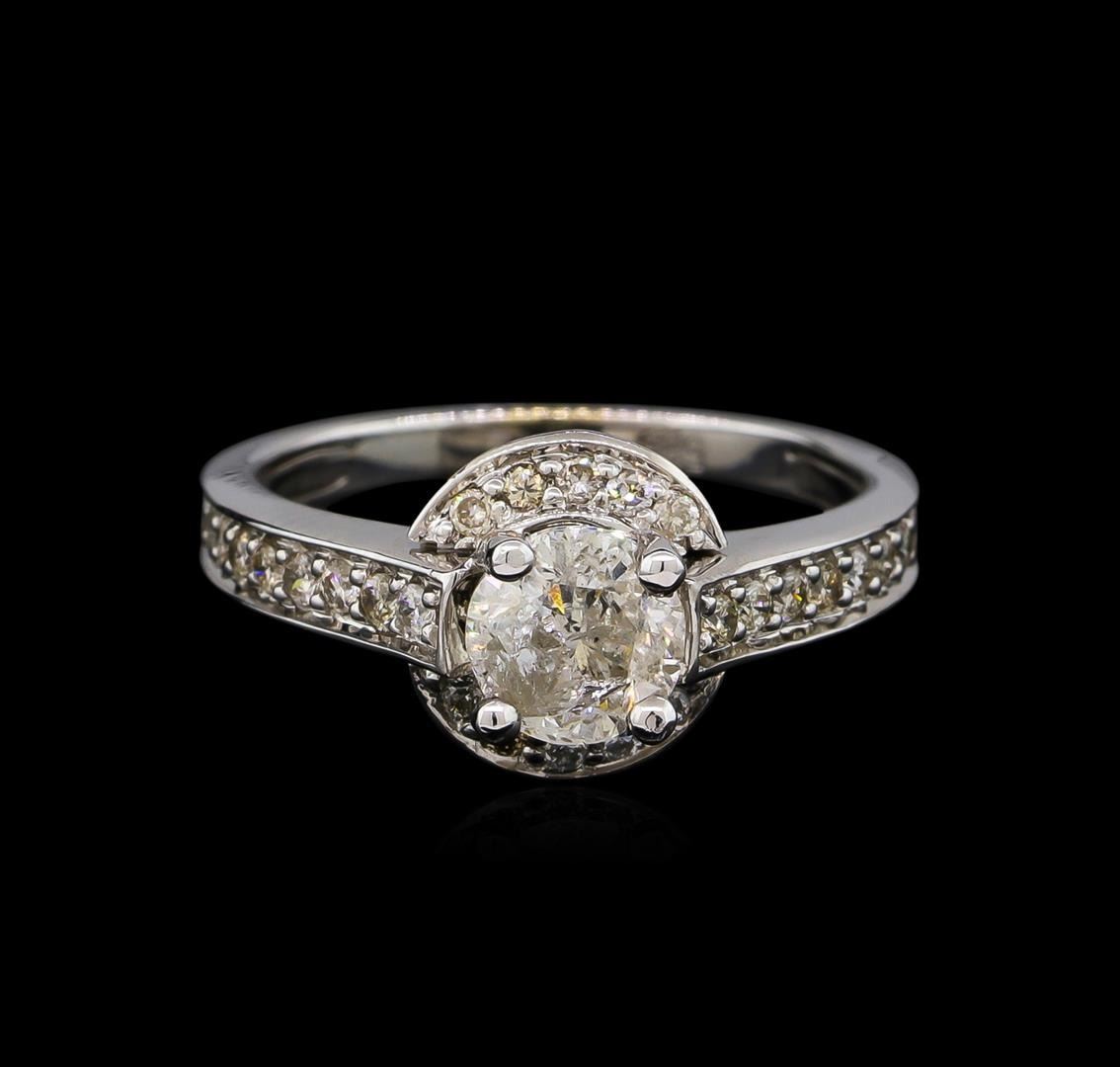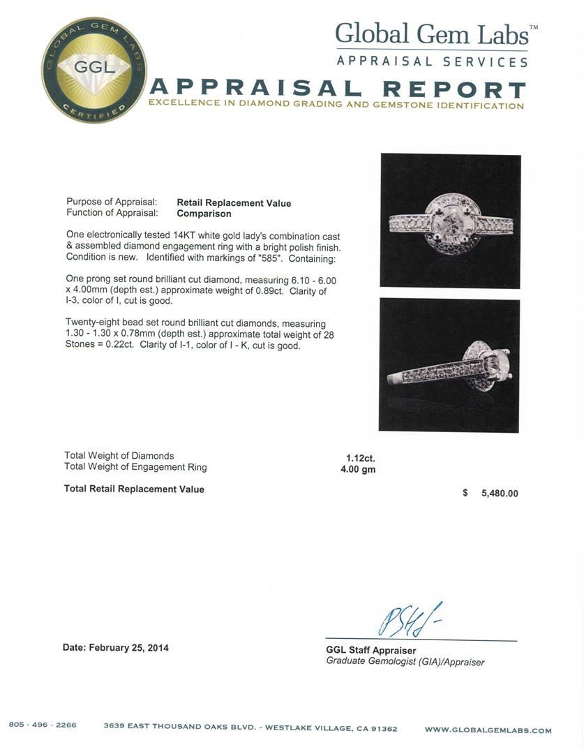 One electronically tested 14KT white gold lady's combination cast & assembled diamond engagement ring with a bright polish finish. Condition is new. Identified with markings of "585". Containing: One prong set round brilliant cut diamond, measuring 6.10 - 6.00 x 4.00mm (depth est.) approximate weight of 0.89ct. Clarity of I-3, color of I, cut is good. Twenty-eight bead set round brilliant cut diamonds, measuring 1.30 - 1.30 x 0.78mm (depth est.) approximate total weight of 28 Stones = 0.22ct. Clarity of I-1, color of I - K, cut is good. Total Weight of Diamonds: 1.12ct. Total Weight of Engagement Ring: 4.00 grams. GGL Appraised.