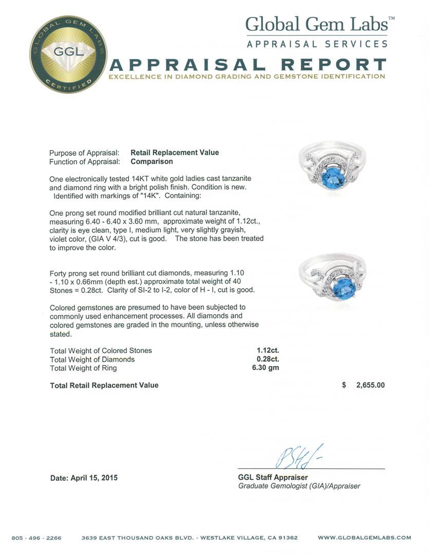 One electronically tested 14KT white gold ladies cast tanzanite and diamond ring with a bright polish finish. Identified with markings of "14K". Condition is new. Containing: One prong set round modified brilliant cut natural tanzanite, measuring 6.40 - 6.40 x 3.60 mm, approximate weight of 1.12ct., clarity is eye clean, type I, medium light, very slightly grayish, violet color, (GIA V 4/3), cut is good. The stone has been heat treated to improve the color. Forty prong set round brilliant cut diamonds, measuring 1.10 - 1.10 x 0.66mm (depth est.) approximate total weight of 40 Stones = 0.28ct. Clarity: SI-2 to I-2. Color: H - I, Cut is Good. Colored gemstones are presumed to have been subjected to commonly used enhancement processes. All diamonds and colored gemstones are graded in the mounting, unless otherwise stated. Total Weight of Colored Stones 1.12ct. Total Weight of Diamonds 0.28ct. Total Weight of Ring 6.30 grams. GGL Appraised at $2,655.00.