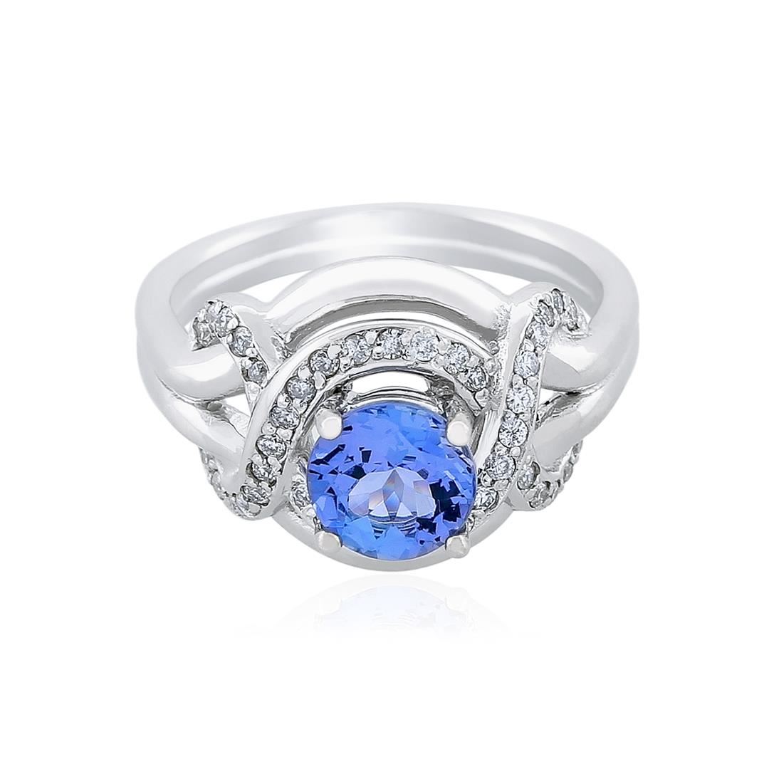 One electronically tested 14KT white gold ladies cast tanzanite and diamond ring with a bright polish finish. Identified with markings of "14K". Condition is new. Containing: One prong set round modified brilliant cut natural tanzanite, measuring 6.40 - 6.40 x 3.60 mm, approximate weight of 1.12ct., clarity is eye clean, type I, medium light, very slightly grayish, violet color, (GIA V 4/3), cut is good. The stone has been heat treated to improve the color. Forty prong set round brilliant cut diamonds, measuring 1.10 - 1.10 x 0.66mm (depth est.) approximate total weight of 40 Stones = 0.28ct. Clarity: SI-2 to I-2. Color: H - I, Cut is Good. Colored gemstones are presumed to have been subjected to commonly used enhancement processes. All diamonds and colored gemstones are graded in the mounting, unless otherwise stated. Total Weight of Colored Stones 1.12ct. Total Weight of Diamonds 0.28ct. Total Weight of Ring 6.30 grams. GGL Appraised at $2,655.00.