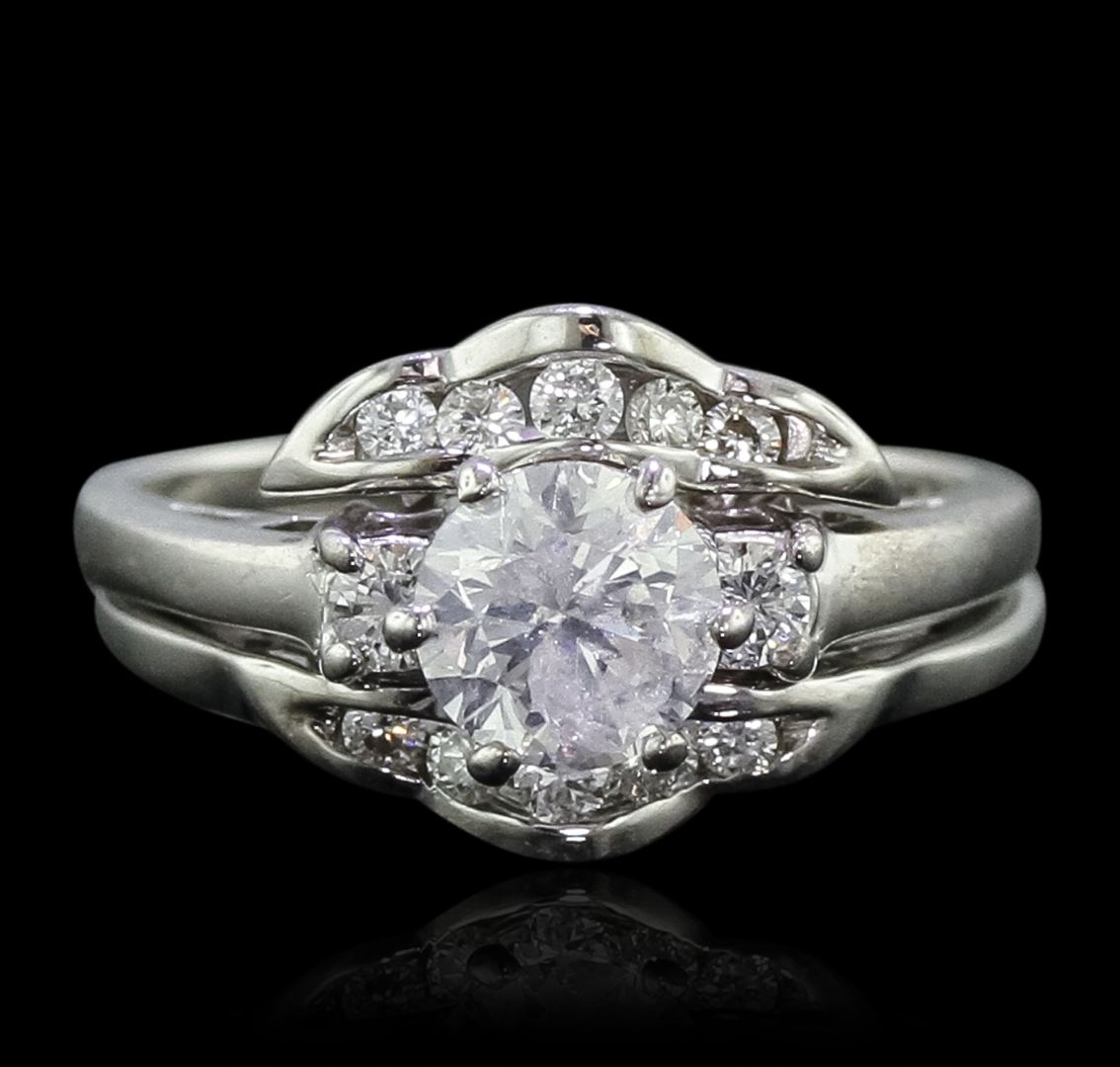 One electronically tested 14KT white gold Ladies combination cast & assembled engagement ring and guard with a bright polish finish. Condition is very good. Identified with markings of "14K". Containing: One prong set round brilliant cut diamond, measuring 6.00 - 6.00 x 3.60mm (depth est.)approximate weight of 0.79ct. Clarity of I-2, color of I, cut is good. Twelve prong set round brilliant cut diamonds, measuring 2.30 - 2.00 x 1.29mm (depth est.)approximate total weight of 12 Stones = 0.33ct. Clarity of I-1, color of J - K, cut is good. Diamonds graded in the mounting. Total Weight of Diamonds 1.12ct. Total Weight of 6.00 grams. GGL Appraised at $7,050.00.