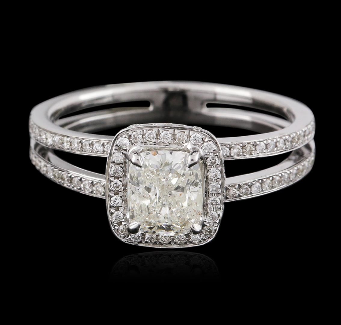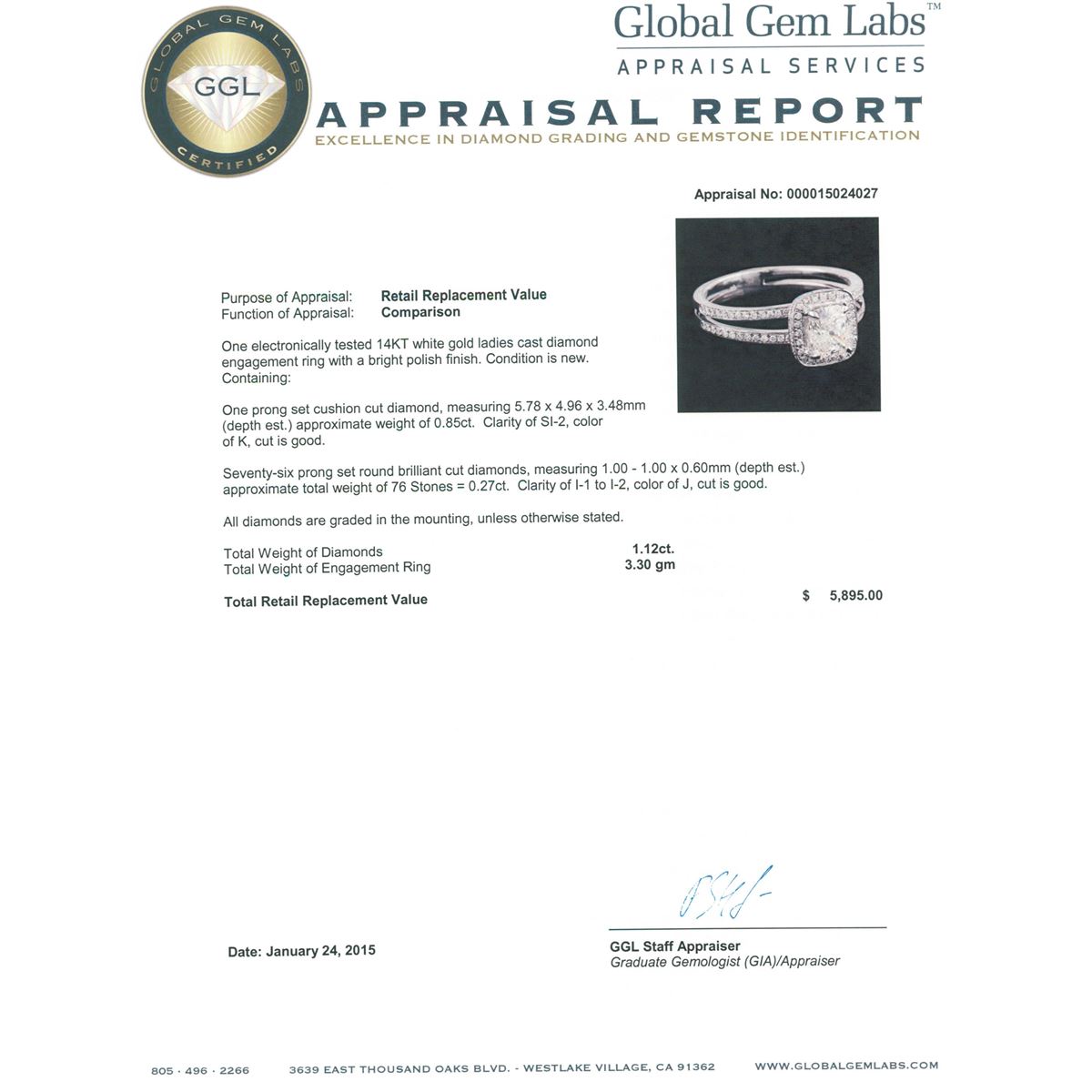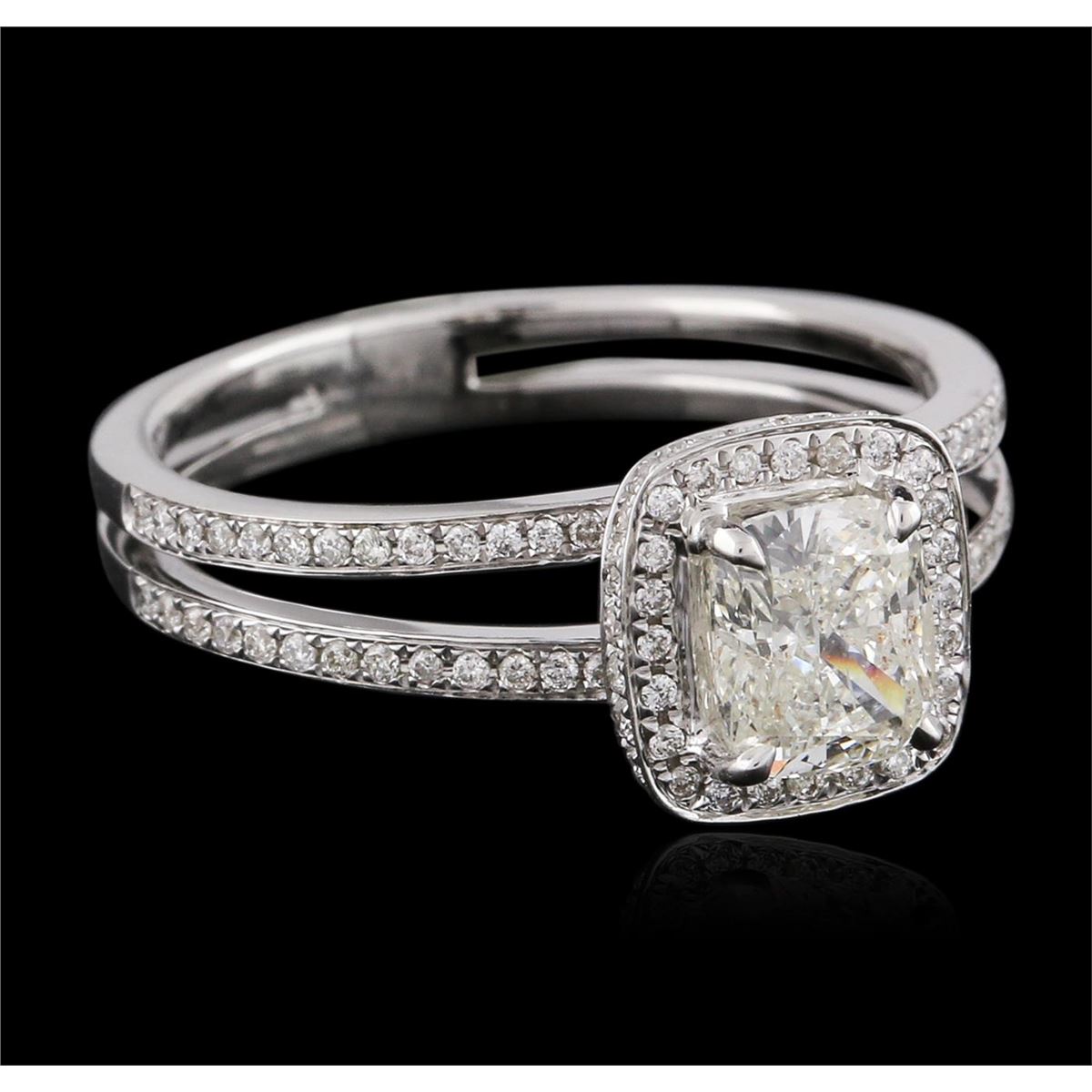 One electronically tested 14KT white gold ladies cast diamond engagement ring with a bright polish finish. Condition is new. Containing: One prong set cushion cut diamond, measuring 5.78 x 4.96 x 3.48mm (depth est.) approximate weight of 0.85ct. Clarity: SI-2. Color: K, Cut is Good. Seventy-Six prong set round brilliant cut diamonds, measuring 1.00. - 1.00. x 0.60mm (depth est.) approximate total weight of 76 Stones = 0.27ct. Clarity: I-1 to I-2. Color: J, Cut is Good. All diamonds are graded in the mounting, unless otherwise stated. Total Weight of Diamonds 1.12ct. Total Weight of Engagement Ring 3.30 grams. GGL Appraised at $5,895.00.