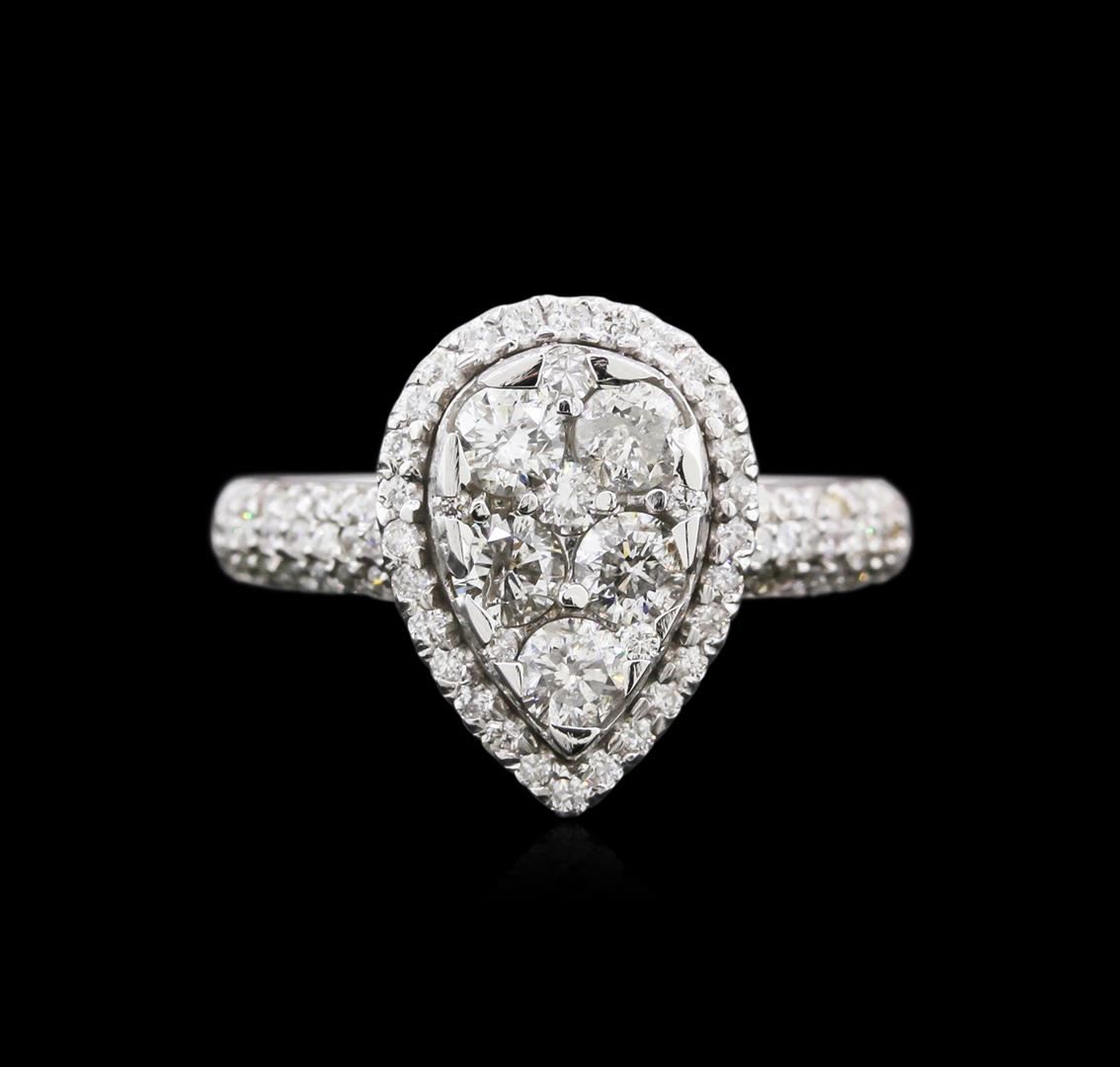 One electronically tested 14KT white gold ladies cast diamond ring with a bright polish finish. Identified with markings of "K14". Condition is new. Containing: Seventy-Eight prong set round brilliant cut diamonds, measuring 1.10 - 1.10 x 0.66mm (depth est.) approximate total weight of 78 Stones = 0.45ct. Clarity: I-1 to I-2. Color: I - J, Cut is Good. Six prong set round brilliant cut diamonds, measuring 3.00 - 3.00 x 1.80mm (depth est.) approximate total weight of 6 Stones = 0.68ct. Clarity: SI-2 to I-1. Color: H - I, Cut is Good. Diamonds are graded in the mounting, unless otherwise stated. Total Weight of Diamonds 1.13ct. Total Weight of Ring 5.30 grams. GGL Appraised at $3,640.00.