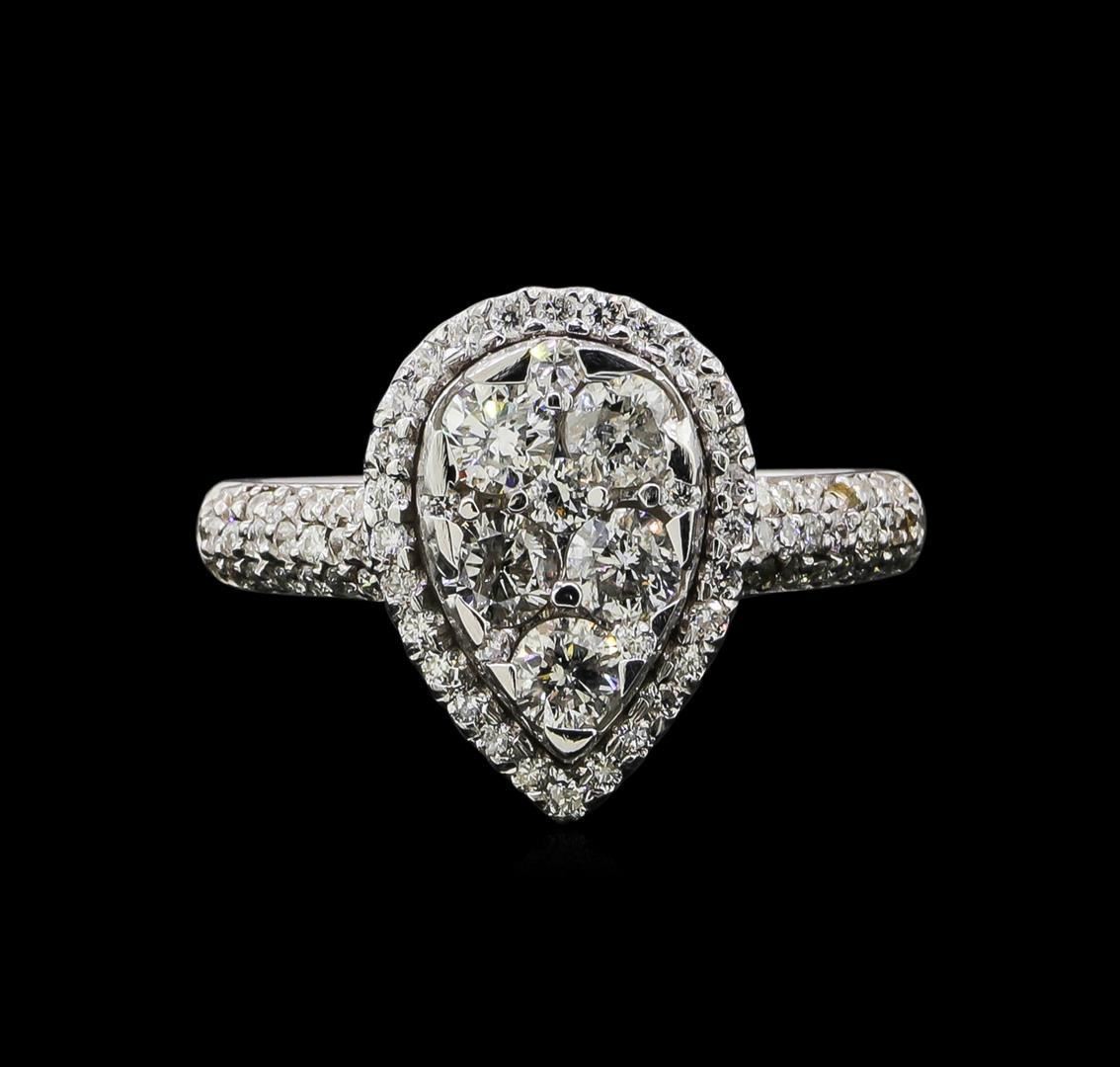 One electronically tested 14KT white gold ladies cast diamond ring with a bright polish finish. Identified with markings of "K14". Condition is new. Containing: Seventy-Eight prong set round brilliant cut diamonds, measuring 1.10 - 1.10 x 0.66mm (depth est.) approximate total weight of 78 Stones = 0.45ct. Clarity: I-1 to I-2. Color: I - J, Cut is Good. Six prong set round brilliant cut diamonds, measuring 3.00 - 3.00 x 1.80mm (depth est.) approximate total weight of 6 Stones = 0.68ct. Clarity: SI-2 to I-1. Color: H - I, Cut is Good. Diamonds are graded in the mounting, unless otherwise stated. Total Weight of Diamonds 1.13ct. Total Weight of Ring 5.30 grams. GGL Appraised.