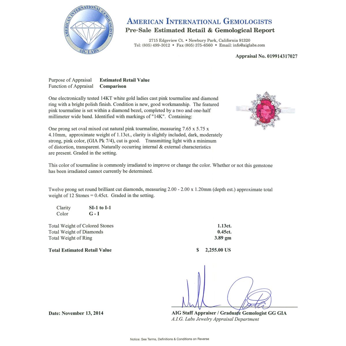 One electronically tested 14KT white gold ladies cast pink tourmaline and diamond ring with a bright polish finish. The featured pink tourmaline is set within a diamond bezel, completed by a two and one-half millimeter wide band. Identified with markings of "14K". Condition is new, good workmanship. Containing: One prong set oval mixed cut natural pink tourmaline, measuring 7.65 x 5.75 x 4.10mm, approximate weight of 1.13ct., clarity is slightly included, dark, moderately strong, pink color, (GIA Pk 7/4), cut is good. Transmitting light with a minimum of distortion, transparent. Naturally occurring internal & external characteristics are present. Graded in the setting. This color of tourmaline is commonly irradiated to improve or change the color. Whether or not this gemstone has been irradiated cannot currently be determined. Twelve prong set round brilliant cut diamonds, measuring 2.00 - 2.00 x 1.20mm (depth est.) approximate total weight of 12 Stones = 0.45ct. Graded in the setting. Clarity SI-1 to I-1. Color G -- I. Total Weight of Colored Stones 1.13ct. Total Weight of Diamonds 0.45ct. Total Weight of Ring 3.89 grams. AIG Appraised at $2,255.00.