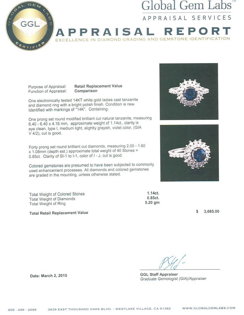 One electronically tested 14KT white gold ladies cast tanzanite and diamond ring with a bright polish finish. Identified with markings of "14K". Condition is new. Containing: One prong set round modified brilliant cut natural tanzanite, measuring 6.40 - 6.40 x 4.16 mm, approximate weight of 1.14ct., clarity is eye clean, type I, medium light, slightly grayish, violet color, (GIA V 4/2), cut is good. Forty prong set round brilliant cut diamonds, measuring 2.00 - 1.60 x 1.08mm (depth est.) approximate total weight of 40 Stones = 0.85ct. Clarity: SI-1 to I-1. Color: I - J, Cut is Good. Colored gemstones are presumed to have been subjected to commonly used enhancement processes. All diamonds and colored gemstones are graded in the mounting, unless otherwise stated. Total Weight of Colored Stones 1.14ct. Total Weight of Diamonds 0.85ct. Total Weight of Ring 5.20 grams. GGL Appraised at $3,685.00.
