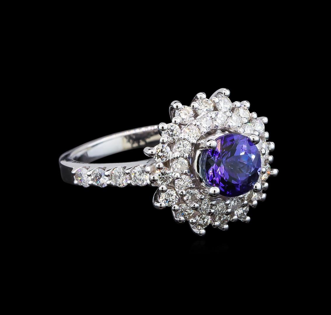 One electronically tested 14KT white gold ladies cast tanzanite and diamond ring with a bright polish finish. Identified with markings of "14K". Condition is new. Containing: One prong set round modified brilliant cut natural tanzanite, measuring 6.40 - 6.40 x 4.16 mm, approximate weight of 1.14ct., clarity is eye clean, type I, medium light, slightly grayish, violet color, (GIA V 4/2), cut is good. Forty prong set round brilliant cut diamonds, measuring 2.00 - 1.60 x 1.08mm (depth est.) approximate total weight of 40 Stones = 0.85ct. Clarity: SI-1 to I-1. Color: I - J, Cut is Good. Colored gemstones are presumed to have been subjected to commonly used enhancement processes. All diamonds and colored gemstones are graded in the mounting, unless otherwise stated. Total Weight of Colored Stones 1.14ct. Total Weight of Diamonds 0.85ct. Total Weight of Ring 5.20 grams. GGL Appraised at $3,685.00.