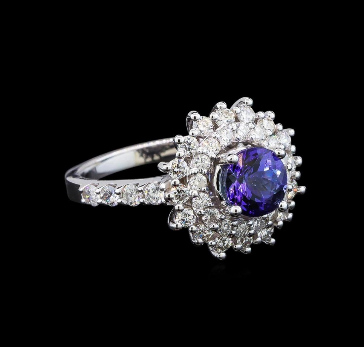 One electronically tested 14KT white gold ladies cast tanzanite and diamond ring with a bright polish finish. Identified with markings of "14K". Condition is new. Containing: One prong set round modified brilliant cut natural tanzanite, measuring 6.40 - 6.40 x 4.16 mm, approximate weight of 1.14ct., clarity is eye clean, type I, medium light, slightly grayish, violet color, (GIA V 4/2), cut is good. Forty prong set round brilliant cut diamonds, measuring 2.00 - 1.60 x 1.08mm (depth est.) approximate total weight of 40 Stones = 0.85ct. Clarity: SI-1 to I-1. Color: I - J, Cut is Good. Colored gemstones are presumed to have been subjected to commonly used enhancement processes. All diamonds and colored gemstones are graded in the mounting, unless otherwise stated. Total Weight of Colored Stones 1.14ct. Total Weight of Diamonds 0.85ct. Total Weight of Ring 5.20 grams. GGL Appraised.