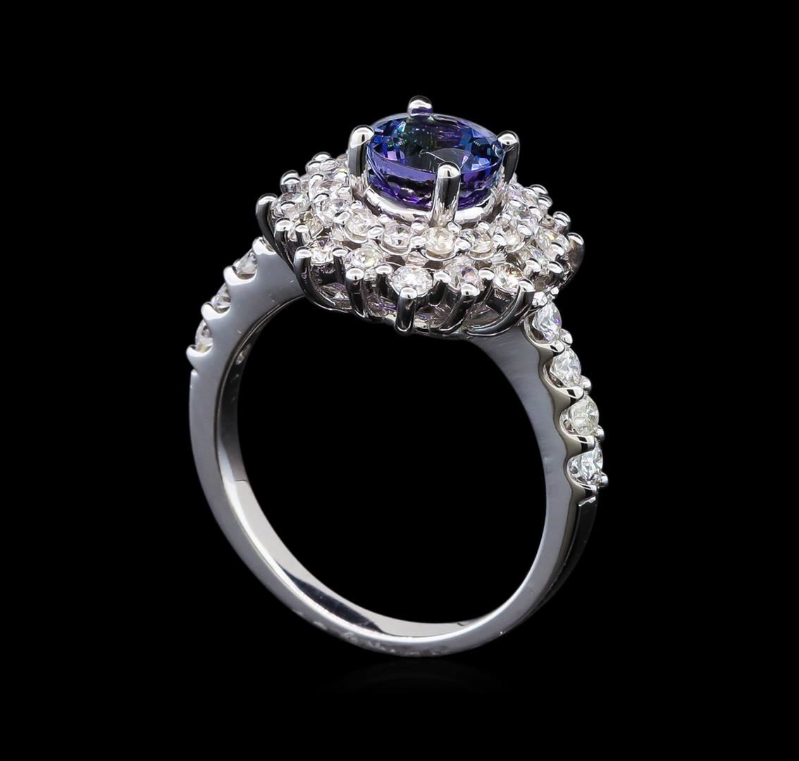 One electronically tested 14KT white gold ladies cast tanzanite and diamond ring with a bright polish finish. Identified with markings of "14K". Condition is new. Containing: One prong set round modified brilliant cut natural tanzanite, measuring 6.40 - 6.40 x 4.16 mm, approximate weight of 1.14ct., clarity is eye clean, type I, medium light, slightly grayish, violet color, (GIA V 4/2), cut is good. Forty prong set round brilliant cut diamonds, measuring 2.00 - 1.60 x 1.08mm (depth est.) approximate total weight of 40 Stones = 0.85ct. Clarity: SI-1 to I-1. Color: I - J, Cut is Good. Colored gemstones are presumed to have been subjected to commonly used enhancement processes. All diamonds and colored gemstones are graded in the mounting, unless otherwise stated. Total Weight of Colored Stones 1.14ct. Total Weight of Diamonds 0.85ct. Total Weight of Ring 5.20 grams. GGL Appraised.