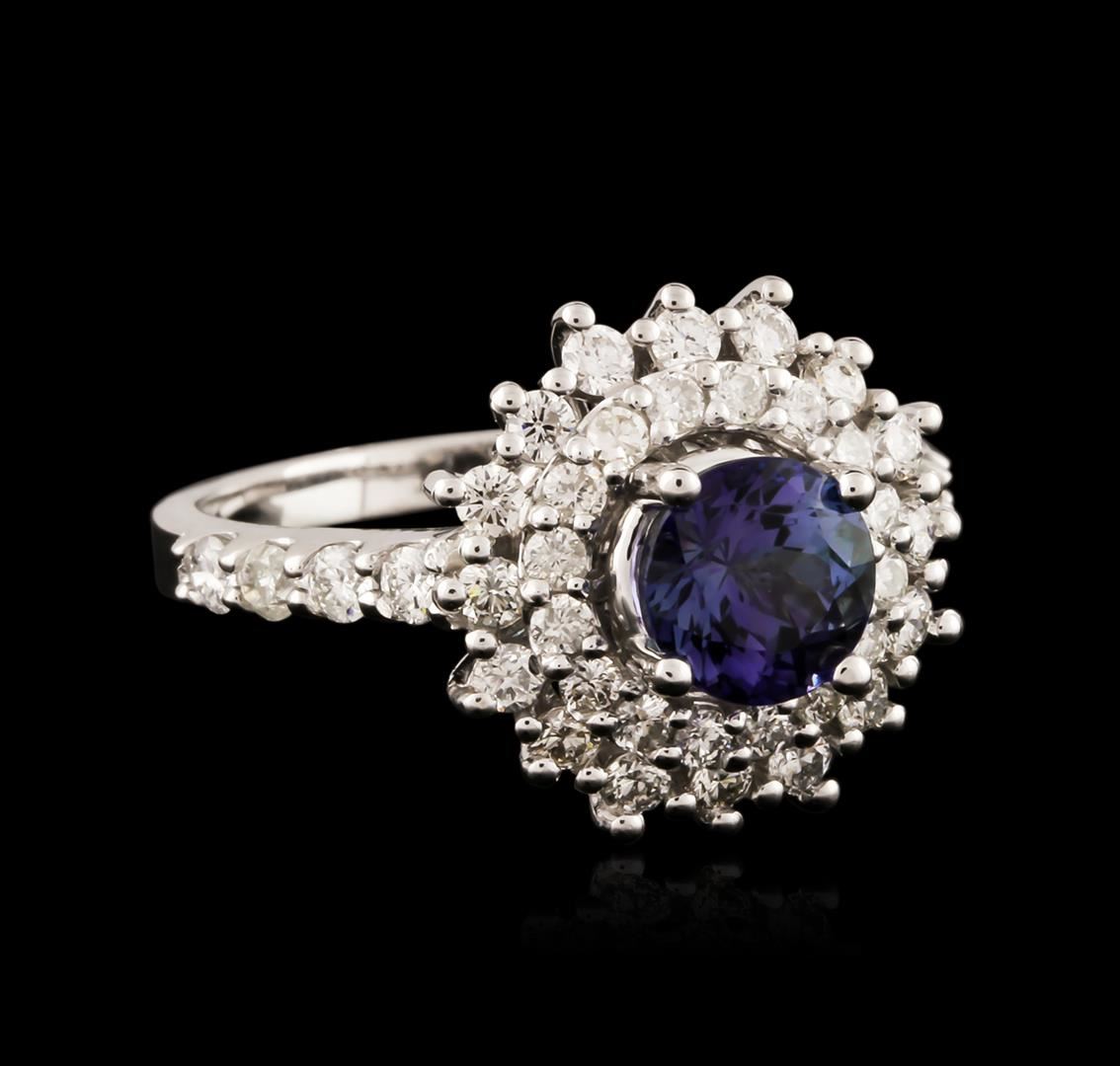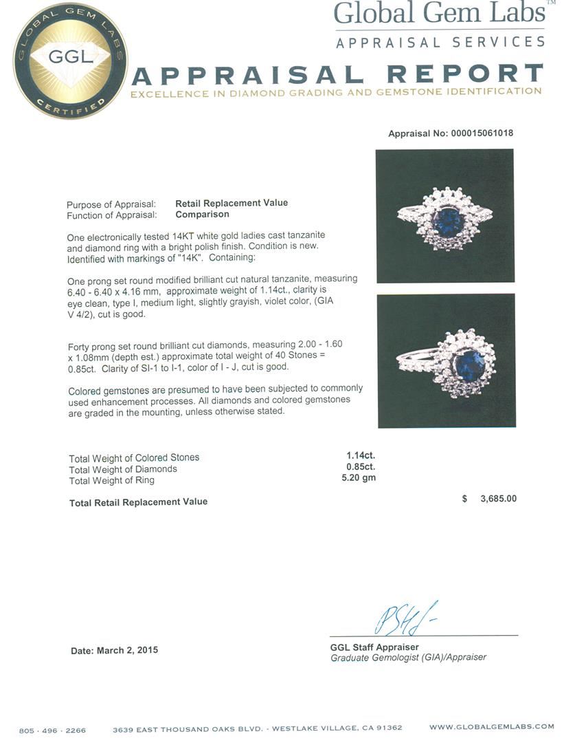 One electronically tested 14KT white gold ladies cast tanzanite and diamond ring with a bright polish finish. Identified with markings of "14K". Condition is new. Containing: One prong set round modified brilliant cut natural tanzanite, measuring 6.40 - 6.40 x 4.16 mm, approximate weight of 1.14ct., clarity is eye clean, type I, medium light, slightly grayish, violet color, (GIA V 4/2), cut is good. Forty prong set round brilliant cut diamonds, measuring 2.00 - 1.60 x 1.08mm (depth est.) approximate total weight of 40 Stones = 0.85ct. Clarity: SI-1 to I-1. Color: I - J, Cut is Good. Colored gemstones are presumed to have been subjected to commonly used enhancement processes. All diamonds and colored gemstones are graded in the mounting, unless otherwise stated. Total Weight of Colored Stones 1.14ct. Total Weight of Diamonds 0.85ct. Total Weight of Ring 5.20 grams. GGL Appraised at $3,685.00.
