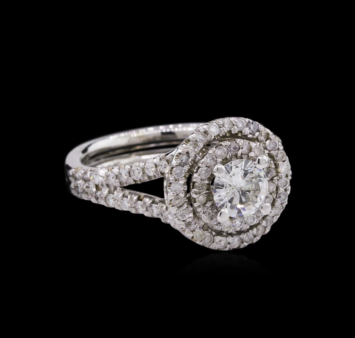 One electronically tested 14KT white gold ladies cast diamond engagement ring with a bright polish finish. Identified with markings of "14K". Condition is new. Containing: One prong set round brilliant cut diamond, measuring 5.30 - 5.30 x 3.18mm (depth est.) approximate weight of 0.55ct. Clarity: I-1. Color: J, Cut is Good. Seventy-Six prong set round brilliant cut diamonds, measuring 1.30 - 1.30 x 0.78mm (depth est.) approximate total weight of 76 Stones = 0.61ct. Clarity: SI-2 to I-2. Color: H - I, Cut is Good. All diamonds are graded in the mounting, unless otherwise stated. Total Weight of Diamonds 1.15ct. Total Weight of Ring 5.60 grams. GGL Appraised at $5,760.00.