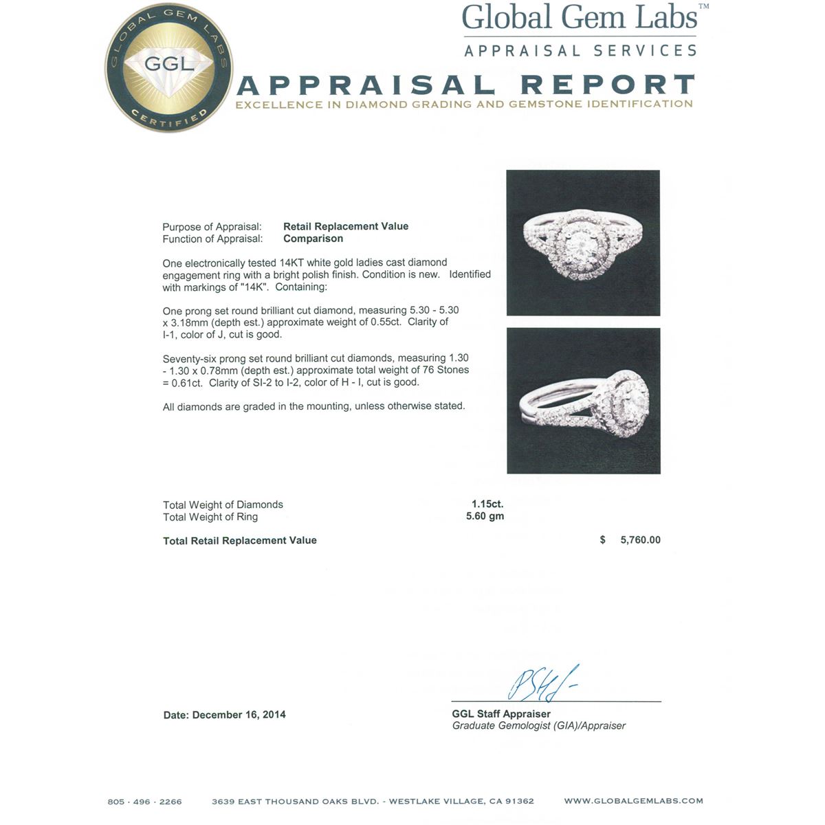 One electronically tested 14KT white gold ladies cast diamond engagement ring with a bright polish finish. Identified with markings of "14K". Condition is new. Containing: One prong set round brilliant cut diamond, measuring 5.30 - 5.30 x 3.18mm (depth est.) approximate weight of 0.55ct. Clarity: I-1. Color: J, Cut is Good. Seventy-Six prong set round brilliant cut diamonds, measuring 1.30 - 1.30 x 0.78mm (depth est.) approximate total weight of 76 Stones = 0.61ct. Clarity: SI-2 to I-2. Color: H - I, Cut is Good. All diamonds are graded in the mounting, unless otherwise stated. Total Weight of Diamonds 1.15ct. Total Weight of Ring 5.60 grams. GGL Appraised at $5,760.00.