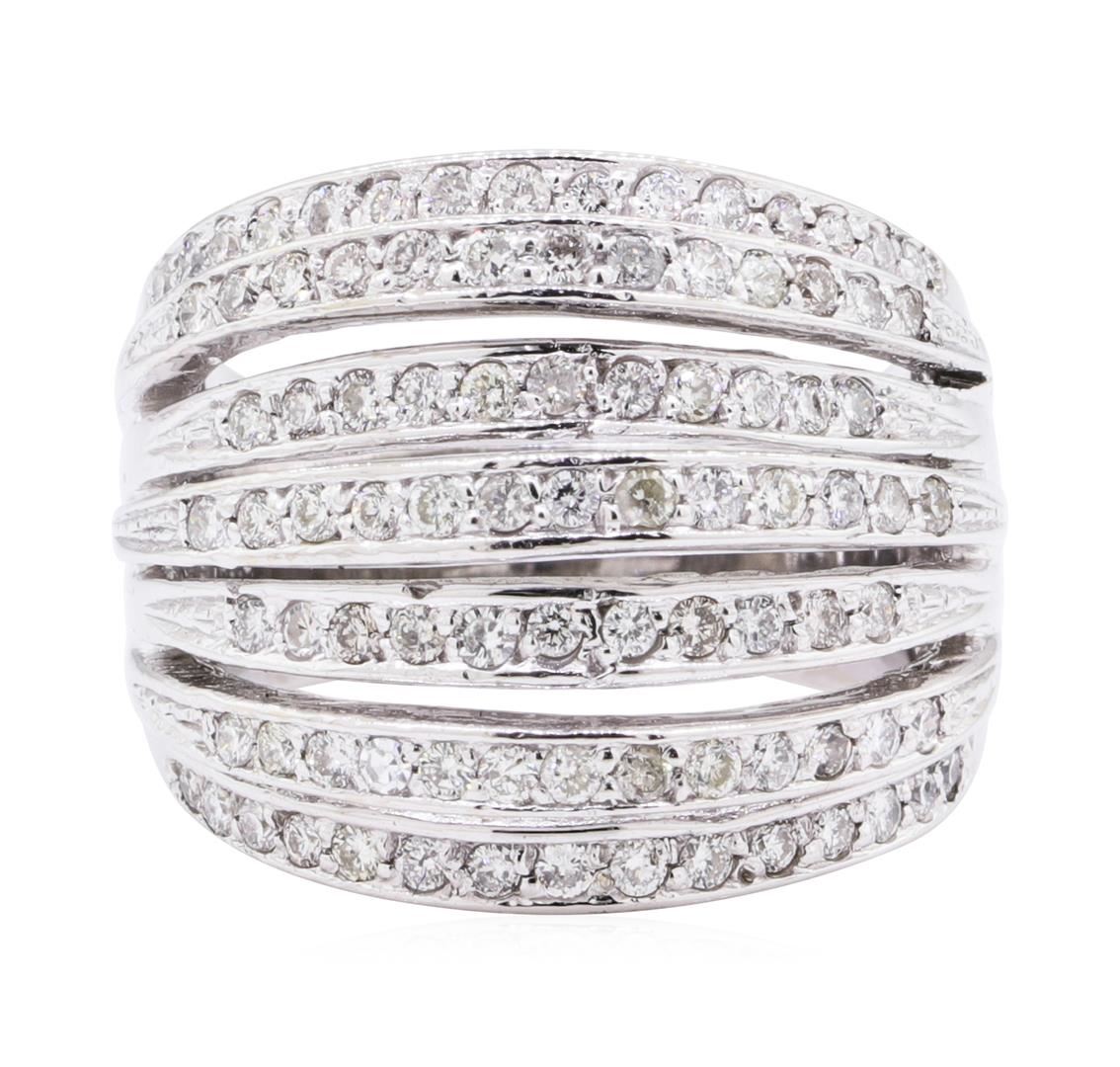 One electronically tested 14KT white gold lady's cast fashion ring with a domed seven row motif with a bright polish finish. The featured lady's ring has a shank measuring 5.15 millimeters wide. Identified with markings of '585'. Condition is like new, good workmanship. Containing: Ninety-Two prong set round brilliant cut diamonds, measuring 1.50 - 1.45 x 0.92mm (depth est.) approximate total weight of 92 Stones = 1.15ct. Graded in the setting. Color I - J, Clarity SI-1 to I-1, Cut Good. Total Weight of Diamonds 1.15ct. Total Weight of Ring 9.90gm. GAS Appraised.