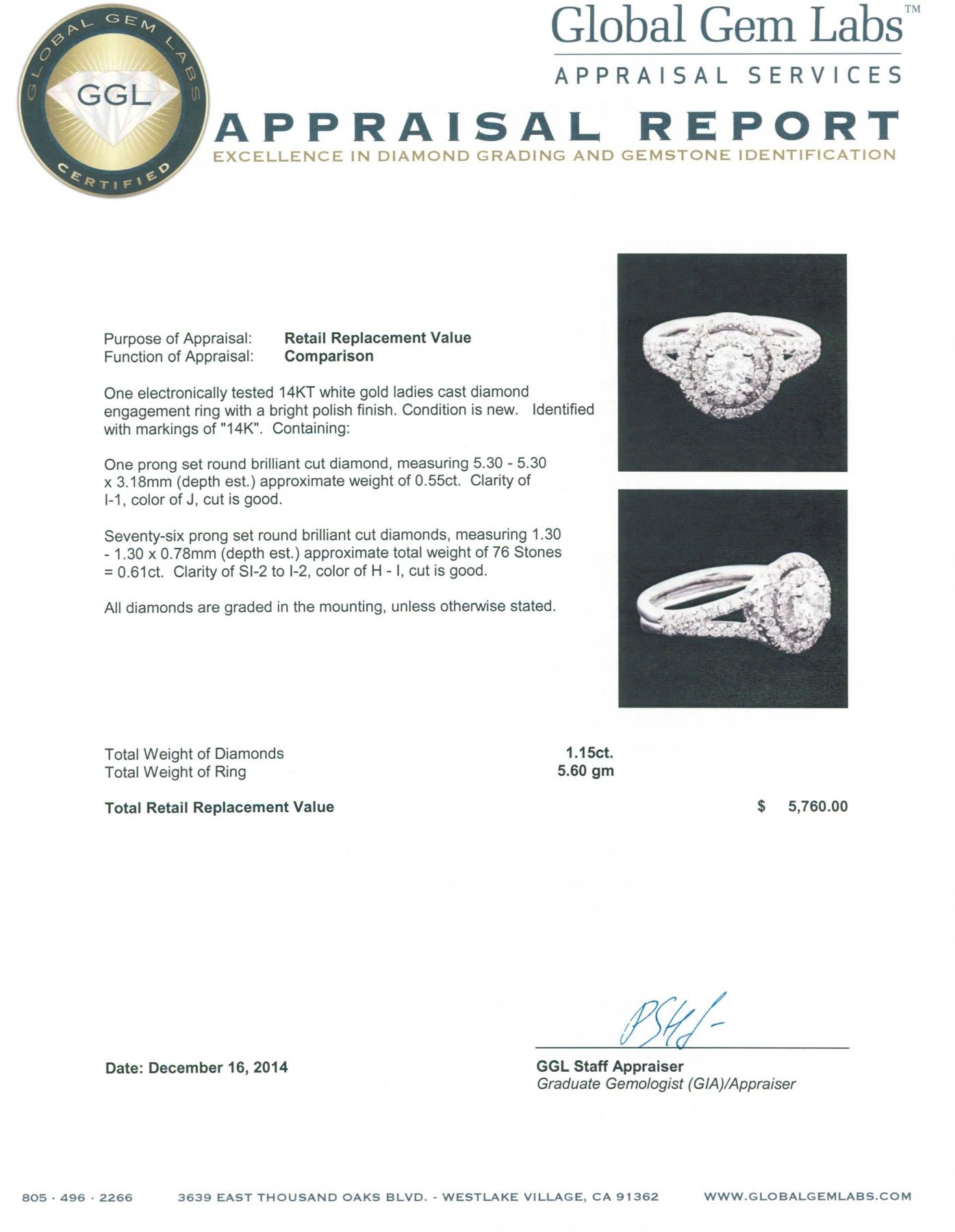 One electronically tested 14KT white gold ladies cast diamond engagement ring with a bright polish finish. Identified with markings of "14K". Condition is new. Containing: One prong set round brilliant cut diamond, measuring 5.30 - 5.30 x 3.18mm (depth est.) approximate weight of 0.55ct. Clarity: I-1. Color: J, Cut is Good. Seventy-Six prong set round brilliant cut diamonds, measuring 1.30 - 1.30 x 0.78mm (depth est.) approximate total weight of 76 Stones = 0.61ct. Clarity: SI-2 to I-2. Color: H - I, Cut is Good. All diamonds are graded in the mounting, unless otherwise stated. Total Weight of Diamonds 1.15ct. Total Weight of Ring 5.60 grams. GGL Appraised.
