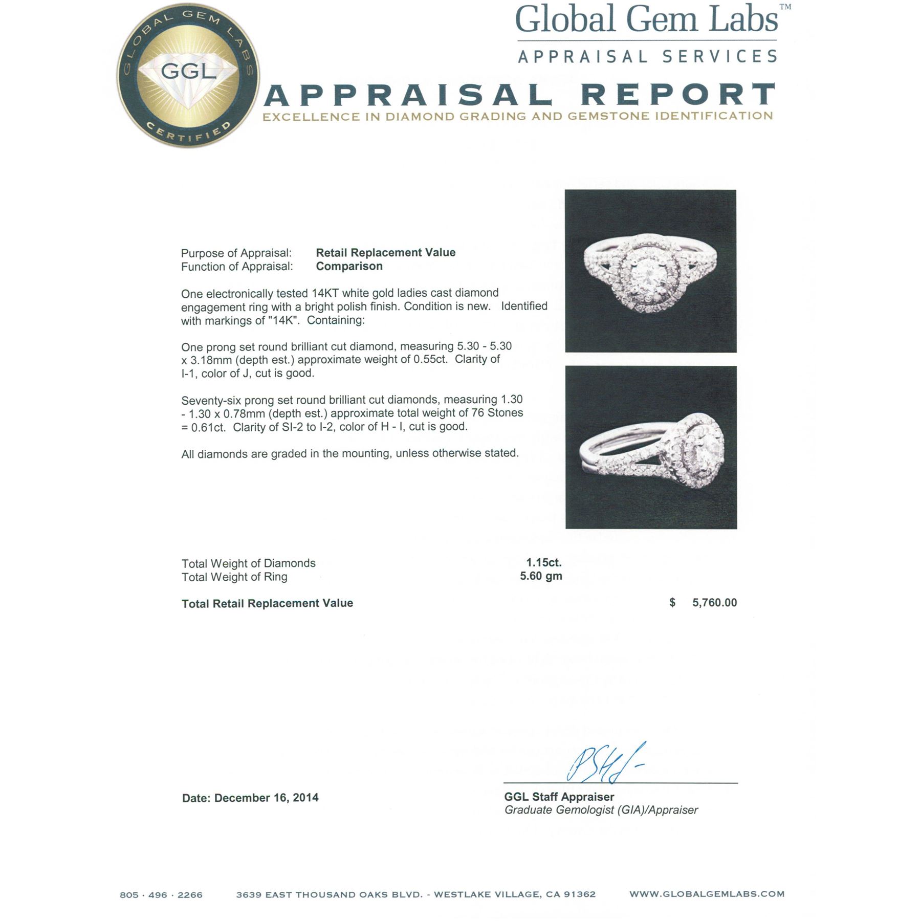 One electronically tested 14KT white gold ladies cast diamond engagement ring with a bright polish finish. Identified with markings of "14K". Condition is new. Containing: One prong set round brilliant cut diamond, measuring 5.30 - 5.30 x 3.18mm (depth est.) approximate weight of 0.55ct. Clarity: I-1. Color: J, Cut is Good. Seventy-Six prong set round brilliant cut diamonds, measuring 1.30 - 1.30 x 0.78mm (depth est.) approximate total weight of 76 Stones = 0.61ct. Clarity: SI-2 to I-2. Color: H - I, Cut is Good. All diamonds are graded in the mounting, unless otherwise stated. Total Weight of Diamonds 1.15ct. Total Weight of Ring 5.60 grams. GGL Appraised.