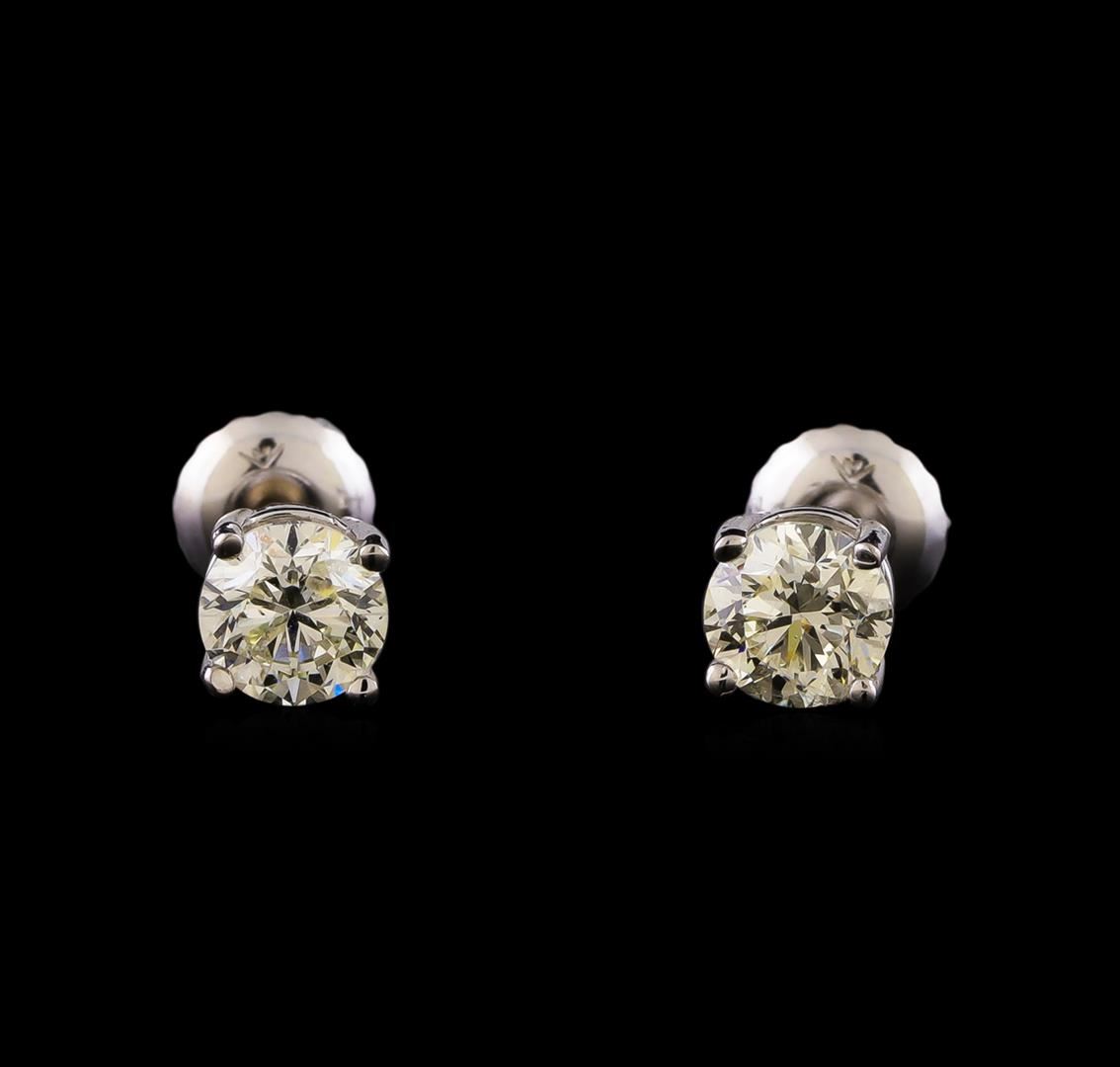 One pair electronically tested 14KT white gold cast & assembled diamond solitaire earrings with screw backs. Bright polish finish. Condition is new, good workmanship. Containing: One prong set round brilliant cut diamond, measuring 4.90 - 4.85 x 3.20mm (depth est.), 4.00% GTCF approximate weight of 0.58ct with a medium blue fluorescence. Graded in the setting. Clarity: SI-2. Color: 65.6%. Table 61.5%. One prong set round brilliant cut diamond, measuring 4.89 - 4.87 x 3.20mm (depth est.), 3.00% GTCF approximate weight of 0.57ct with a faint blue fluorescence. Graded in the setting. Clarity: I-1. Color: 65.6%. Table 57.4%. Total Weight of Diamonds 1.15ct. Total Weight of Earrings 1.02 grams. AIG Appraised at $5,265.00.