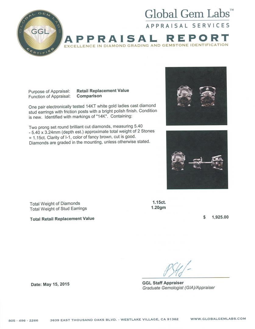 One pair electronically tested 14KT white gold ladies cast diamond stud earrings with friction posts with a bright polish finish. Identified with markings of "14K". Condition is new. Containing: Two prong set round brilliant cut diamonds, measuring 5.40 - 5.40 x 3.24mm (depth est.) approximate total weight of 2 Stones = 1.15ct. Clarity: I-1, Cut is Good. Diamonds are graded in the mounting, unless otherwise stated. Total Weight of Diamonds 1.15ct. Total Weight of Stud Earrings 1.20 grams. GGL Appraised at $1,925.00.