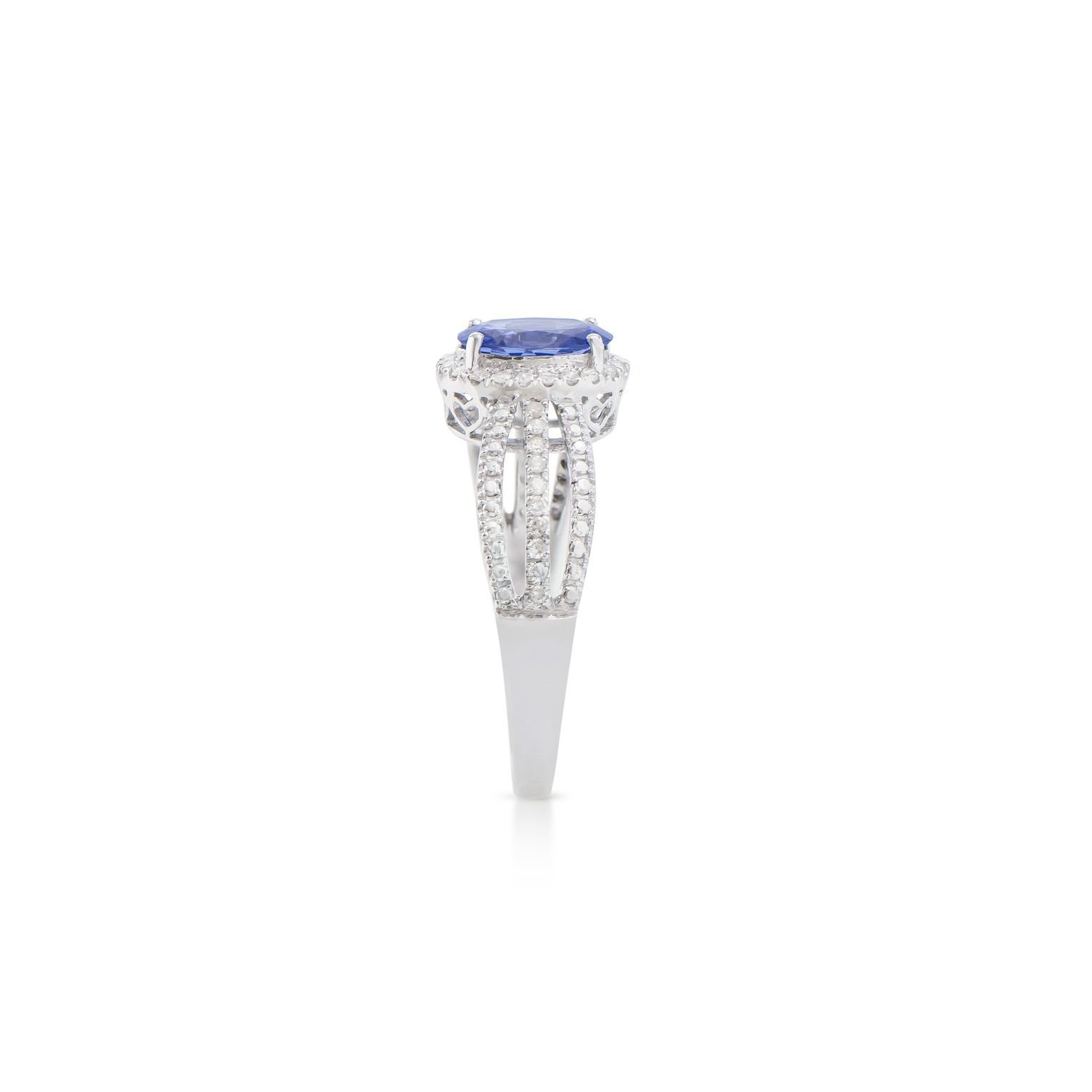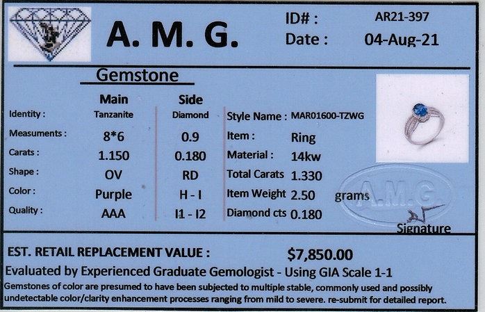 (1) Tanzanite with a total weight of 1.15cts. (42) round Diamonds with a total weight of 0.18cts with a color of H-I and clarity of I1-I2. Total weight of the ring is 2.50 grams. Ring size 7.5.