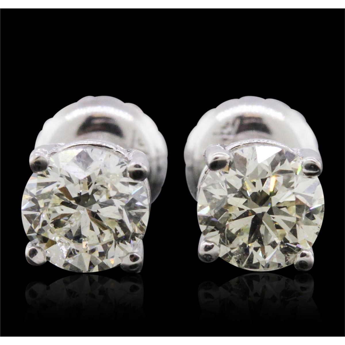 One pair electronically tested 14KT white gold cast & assembled diamond solitaire earrings with screw backs. Bright polish finish. Condition is new, good workmanship. Containing: One prong set round brilliant cut diamond, measuring 4.90 - 4.85 x 3.20mm (depth est.), 4.00% GTCF approximate weight of 0.58ct with a medium blue fluorescence. Graded in the setting. Clarity: SI-2. Color: 65.6%. Table 61.5%. One prong set round brilliant cut diamond, measuring 4.89 - 4.87 x 3.20mm (depth est.), 3.00% GTCF approximate weight of 0.57ct with a faint blue fluorescence. Graded in the setting. Clarity: I-1. Color: 65.6%. Table 57.4%. Total Weight of Diamonds 1.15ct. Total Weight of Earrings 1.02 grams. AIG Appraised at $5,265.00.