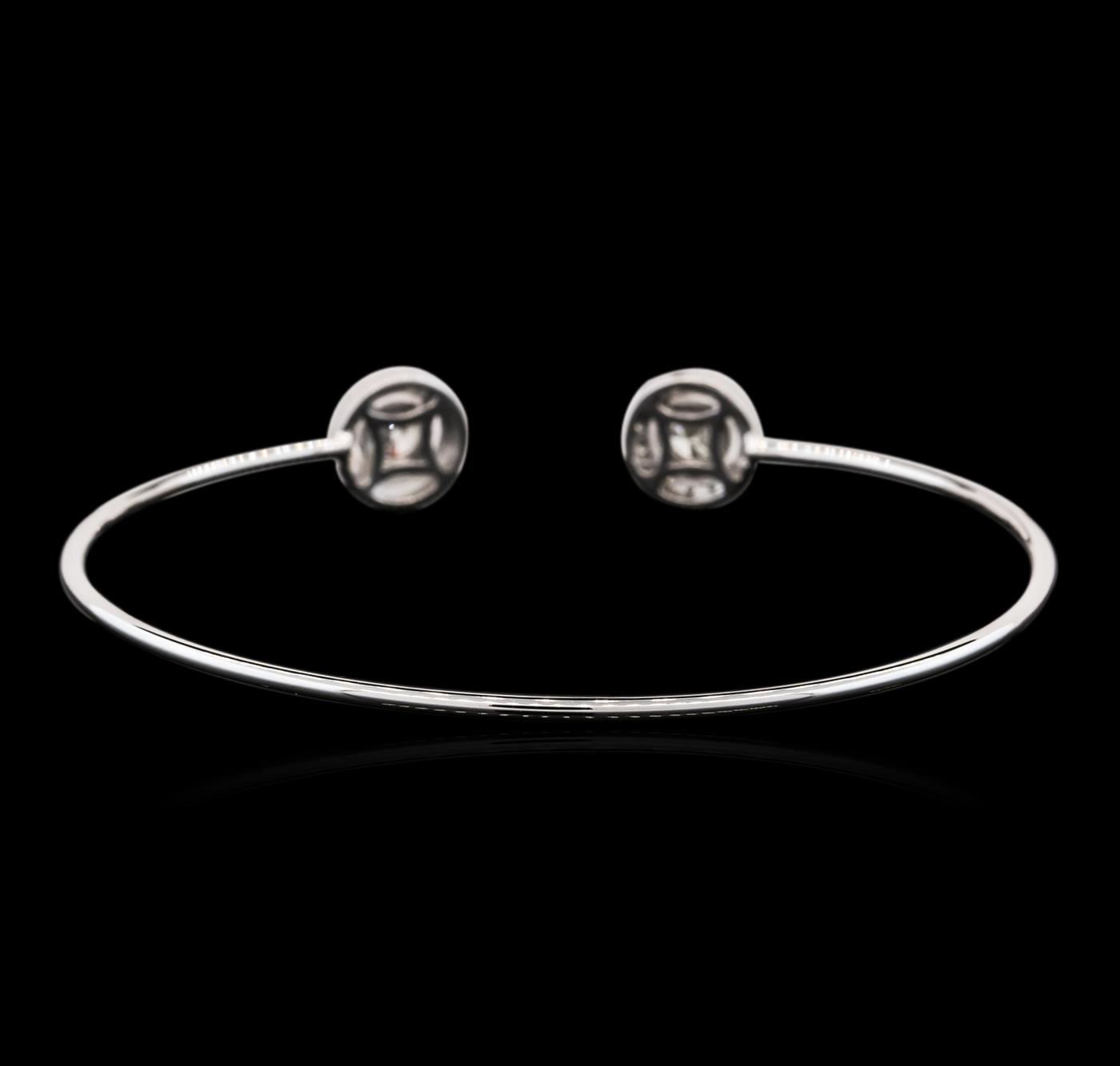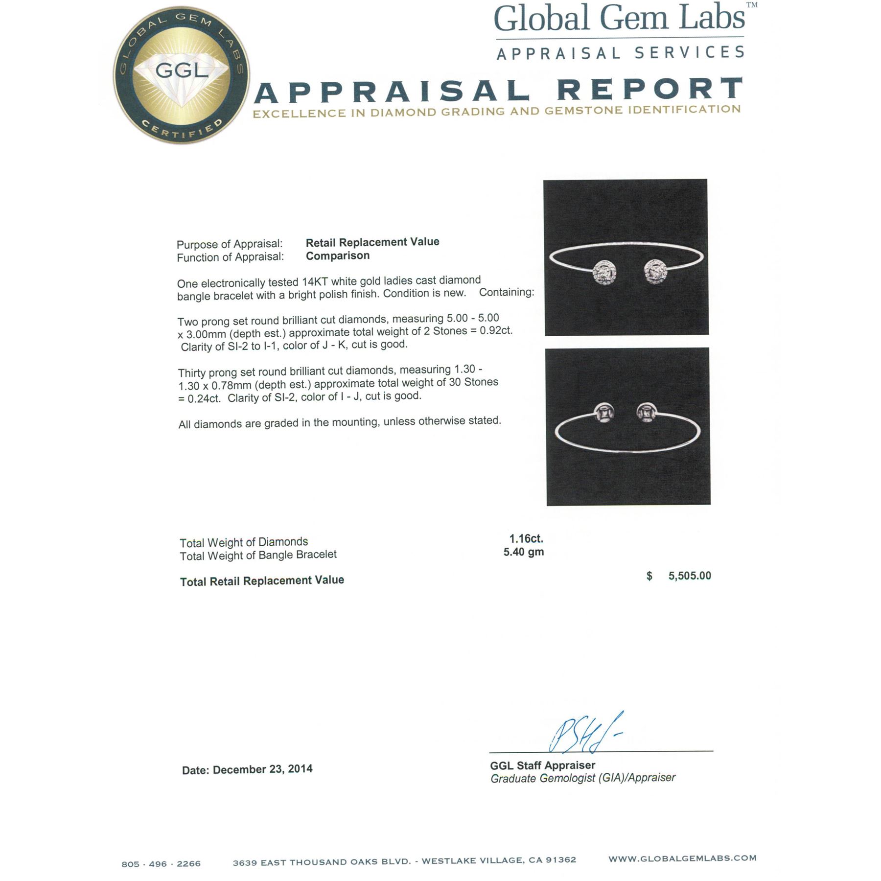 One electronically tested 14KT white gold ladies cast diamond bangle bracelet with a bright polish finish. Condition is new. Containing: Two prong set round brilliant cut diamonds, measuring 5.00 - 5.00 x 3.00mm (depth est.) approximate total weight of 2 Stones = 0.92ct. Clarity: SI-2 to I-1. Color: J - K, Cut is Good. Thirty prong set round brilliant cut diamonds, measuring 1.30 - 1.30 x 0.78mm (depth est.) approximate total weight of 30 Stones = 0.24ct. Clarity: SI-2. Color: I - J, Cut is Good. All diamonds are graded in the mounting, unless otherwise stated. Total Weight of Diamonds 1.16ct. Total Weight of Bangle Bracelet 5.40 grams. GGL Appraised at $5,505.00.