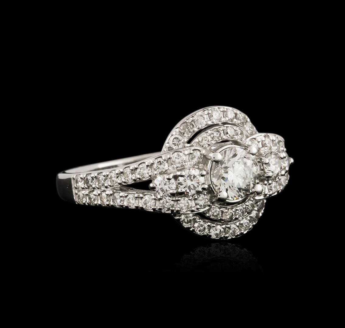 One electronically tested 14KT white gold ladies cast diamond engagement ring with a bright polish finish. Identified with markings of "14K". Condition is new. Containing: One prong set round brilliant cut diamond, measuring 5.00 - 5.00 x 3.00mm (depth est.) approximate weight of 0.46ct. Clarity: I-1. Color: J, Cut is Good. Sixty prong set round brilliant cut diamonds, measuring 2.50 - 1.20 x 1.11mm (depth est.) approximate total weight of 60 Stones = 0.70ct. Clarity: SI-1 to I-1. Color: H - I, Cut is Good. All diamonds are graded in the mounting, unless otherwise stated. Total Weight of Diamonds 1.16ct. Total Weight of Ring 5.00 grams. GGL Appraised at $4,125.00.