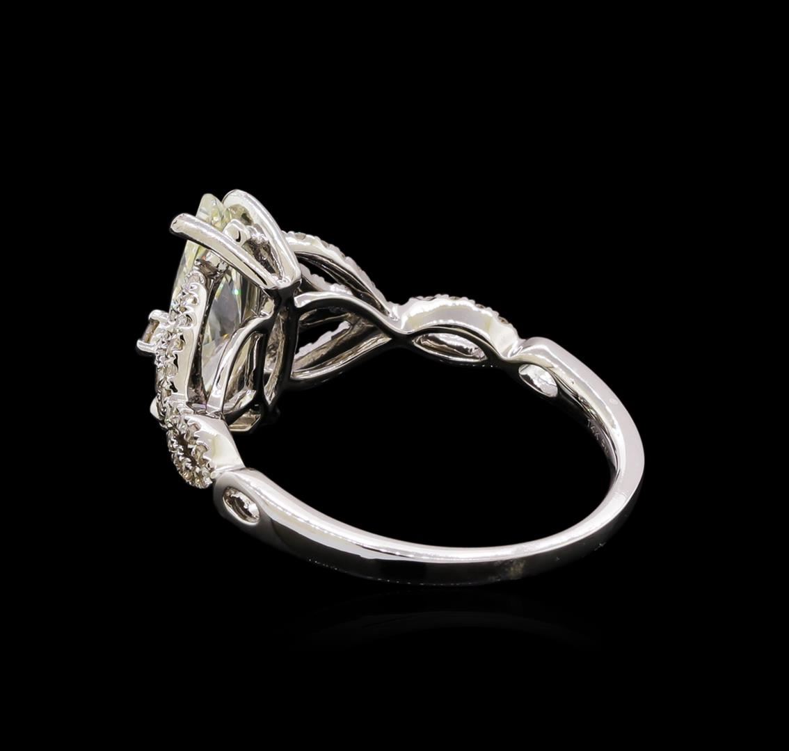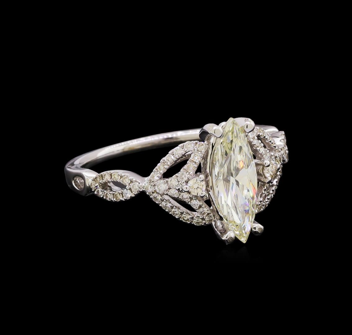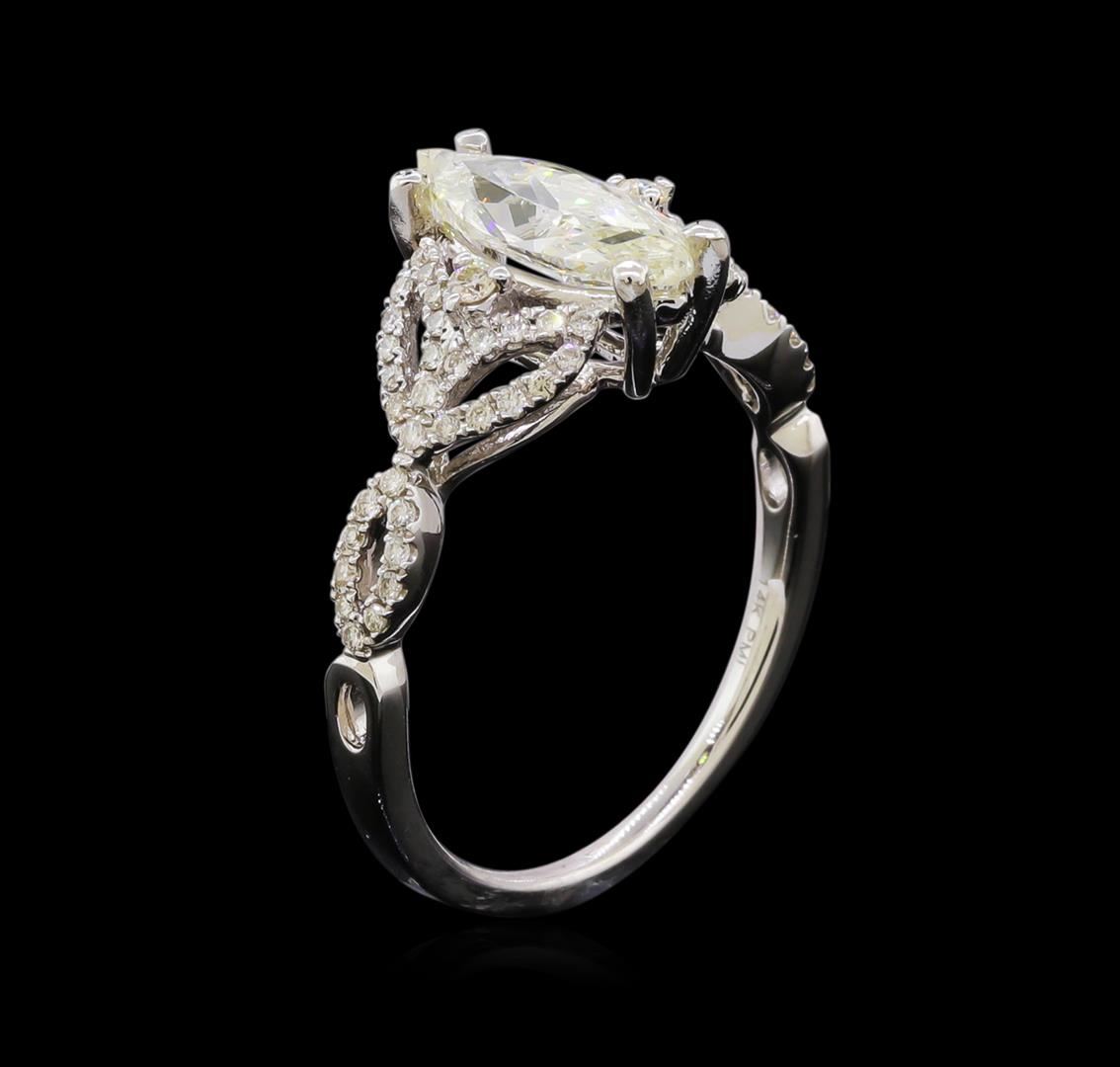 One electronically tested 14KT white gold ladies combination cast & assembled engagement ring with a split shank with a bright polish finish. Identified with markings of "14K". Condition is new. Containing: One prong set marquise shaped cut diamond, measuring 11.48 x 4.20 x 2.65mm (depth est.) approximate weight of 0.76ct. Clarity: SI-1. Color: K, Cut is Good. Sixty-Six prong set round brilliant cut diamonds, measuring 1.70 - 1.00 x 0.81mm (depth est.) approximate total weight of 66 Stones = 0.40ct. Clarity: SI-2 to I-2. Color: J - K, Cut is Good. All diamonds are graded in the mounting, unless otherwise stated. Total Weight of Diamonds 1.16ct. Total Weight of Ring 2.70 grams. GGL Appraised at $7,015.00.