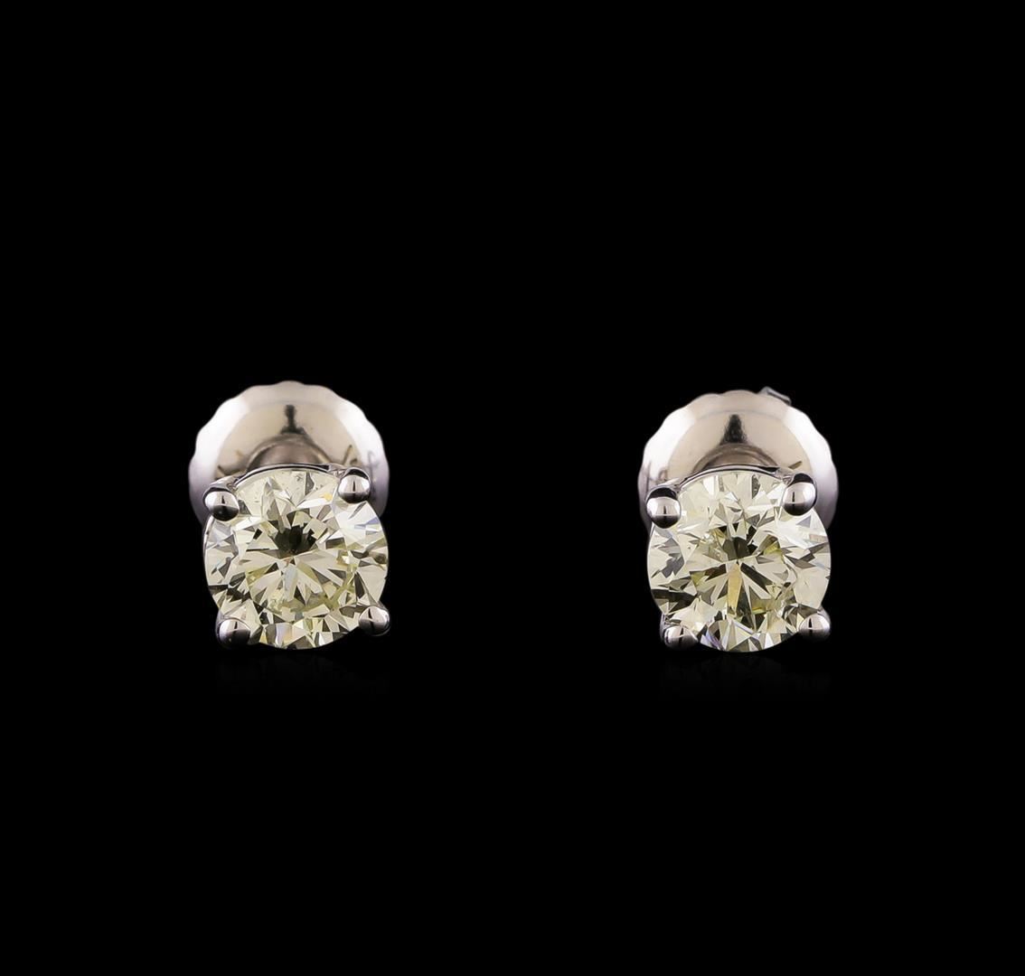One pair electronically tested 14KT white gold cast & assembled diamond solitaire earrings with screw backs. Bright polish finish. Condition is new, good workmanship. Containing: One prong set round brilliant cut diamond, measuring 4.85 - 4.84 x 3.20mm (depth est.), 5.00% GTCF approximate weight of 0.58ct with a faint blue fluorescence. Graded in the setting. Clarity: SI-2. Depth: 66.0%. Table 61.9%. One prong set round brilliant cut diamond, measuring 4.80 - 4.79 x 3.20mm (depth est.), 5.00% GTCF approximate weight of 0.58ct with a medium blue fluorescence. Graded in the setting. Clarity: SI-2. Depth: 66.7%. Table 60.4%. Total Weight of Diamonds 1.16ct. Total Weight of Earrings 0.95 grams. AIG Appraised.