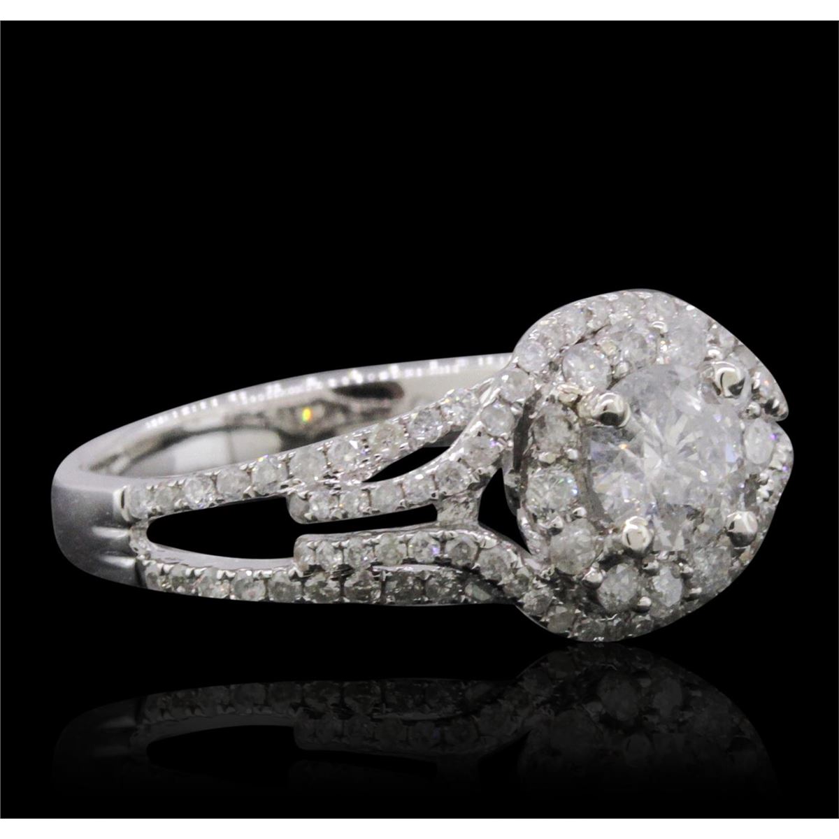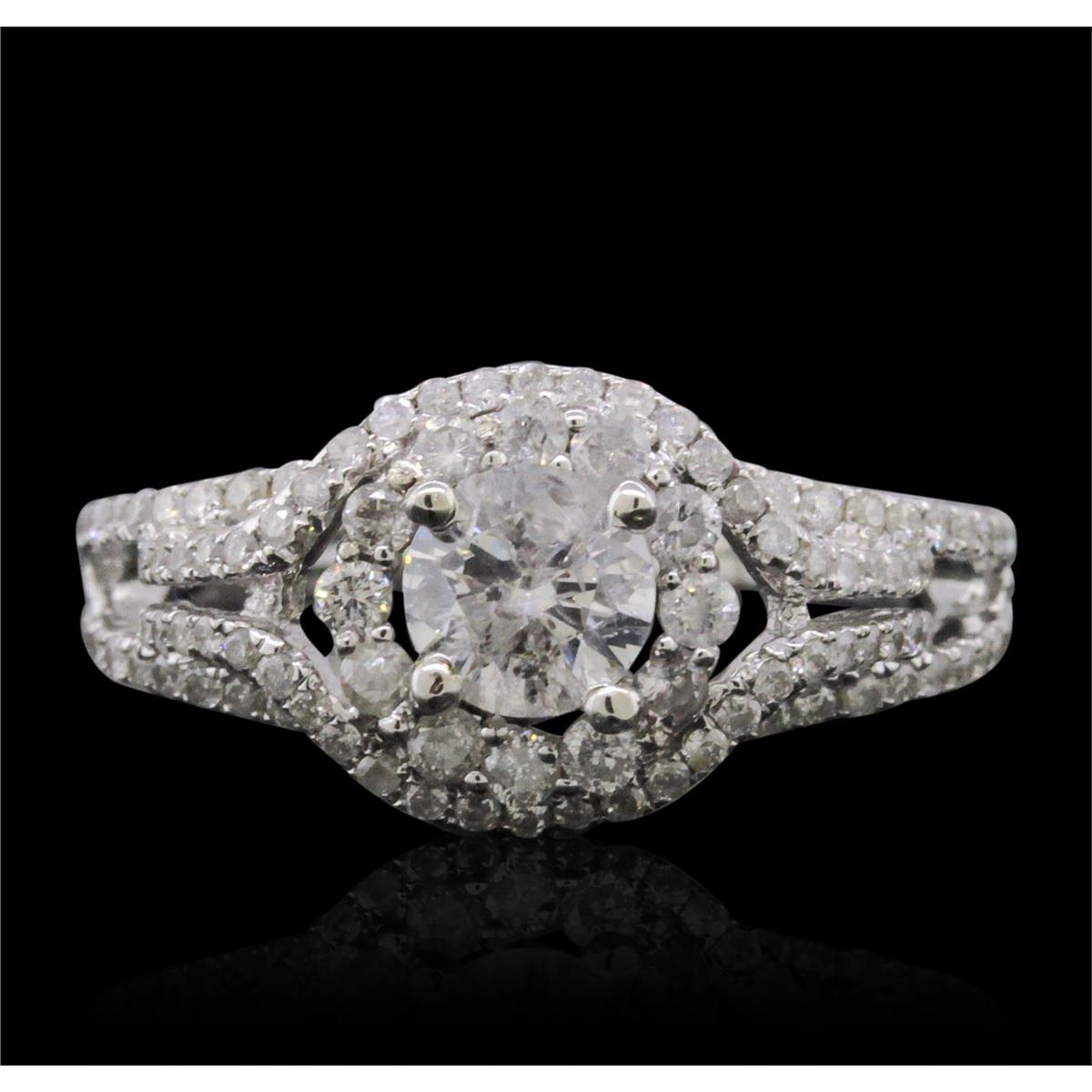 One electronically tested 14KT white gold ladies combination cast & assembled engagement ring with a split shank with a bright polish finish. Identified with markings of "14K". Condition is new. Containing: One prong set round brilliant cut diamond, measuring 5.40 - 5.37 x 3.24mm (depth est.) approximate weight of 0.57ct. Clarity: I-3. Color: J, Cut is Good. One Hundred prong set round brilliant cut diamonds, measuring 1.50 - 1.00 x 0.75mm (depth est.) approximate total weight of 100 Stones = 0.60ct. Clarity: I-1 to I-2. Color: I - J, Cut is Good. All diamonds are graded in the mounting, unless otherwise stated. Total Weight of Diamonds 1.17ct. Total Weight of Ring 4.10 grams. GGL Appraised at $4,025.00.