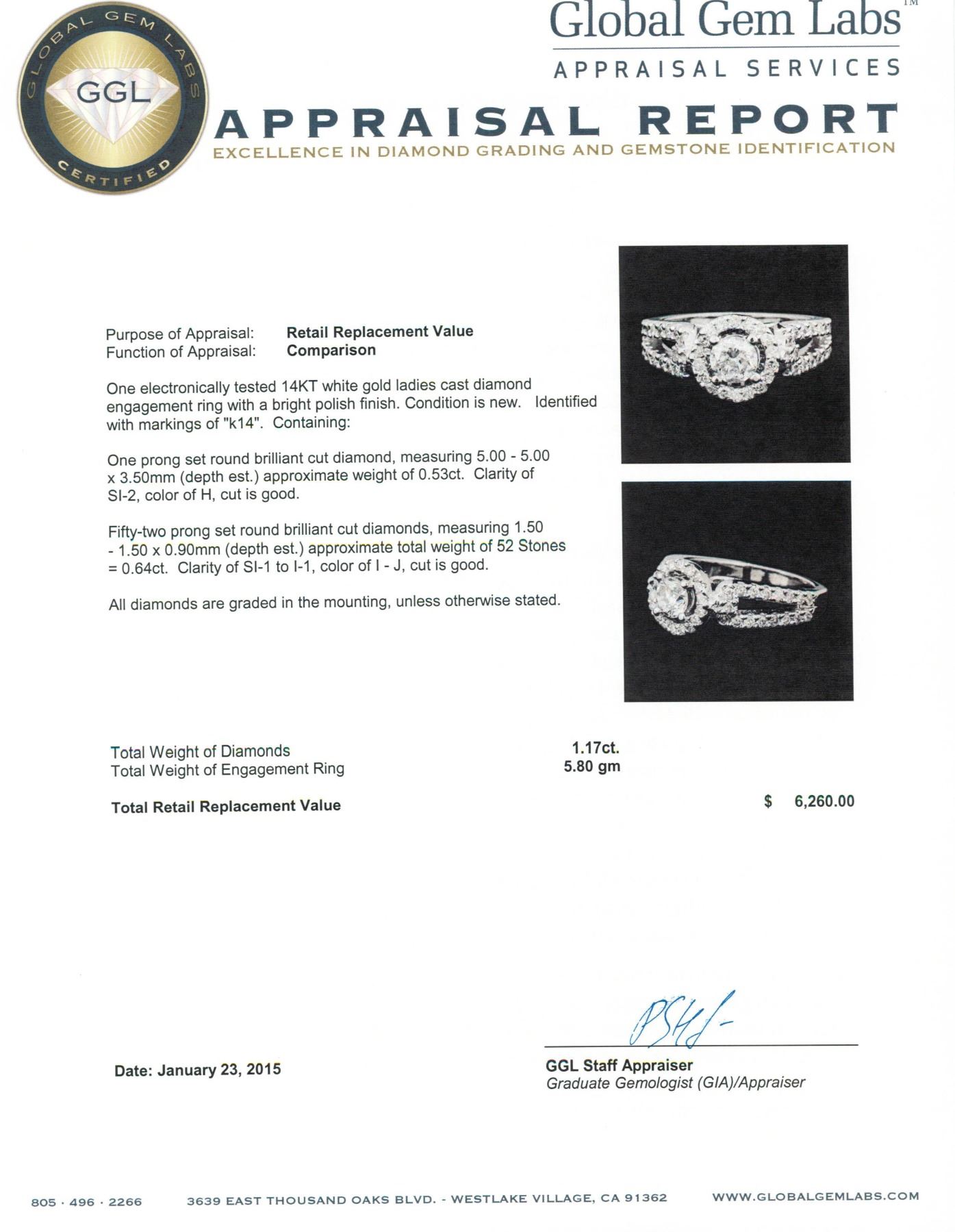 One electronically tested 14KT white gold ladies cast diamond engagement ring with a bright polish finish. Identified with markings of "k14". Condition is new. Containing: One prong set round brilliant cut diamond, measuring 5.00 - 5.00 x 3.50mm (depth est.) approximate weight of 0.53ct. Clarity: SI-2. Color: H, Cut is Good. Fifty-Two prong set round brilliant cut diamonds, measuring 1.50 - 1.50 x 0.90mm (depth est.) approximate total weight of 52 Stones = 0.64ct. Clarity: SI-1 to I-1. Color: I - J, Cut is Good. All diamonds are graded in the mounting, unless otherwise stated. Total Weight of Diamonds 1.17ct. Total Weight of Engagement Ring 5.80 grams. GGL Appraised.