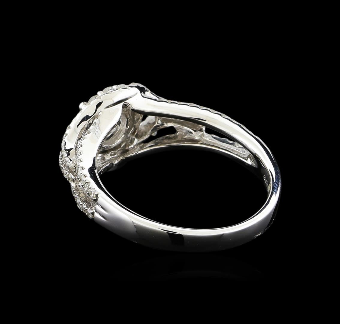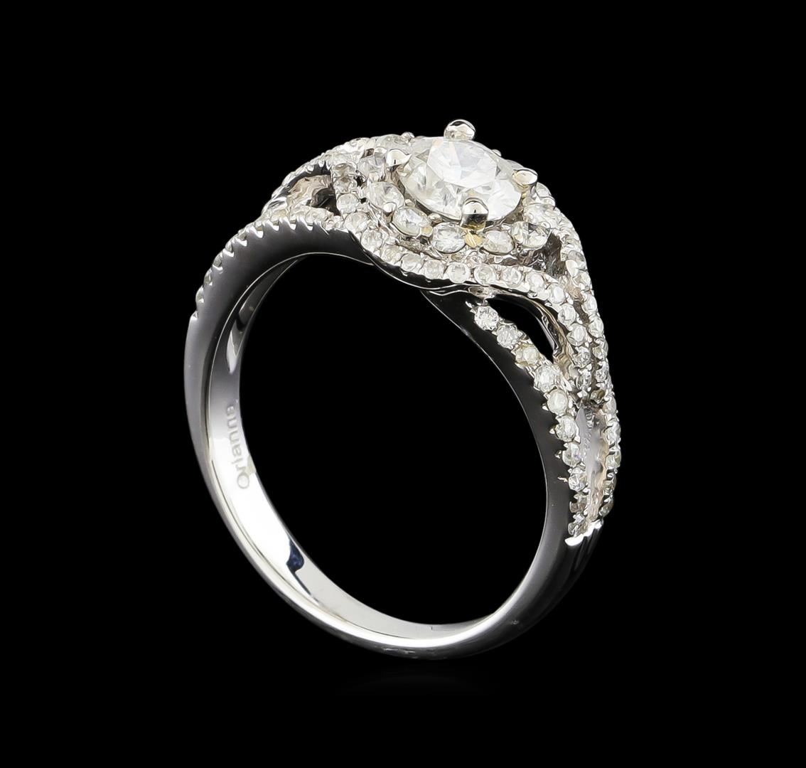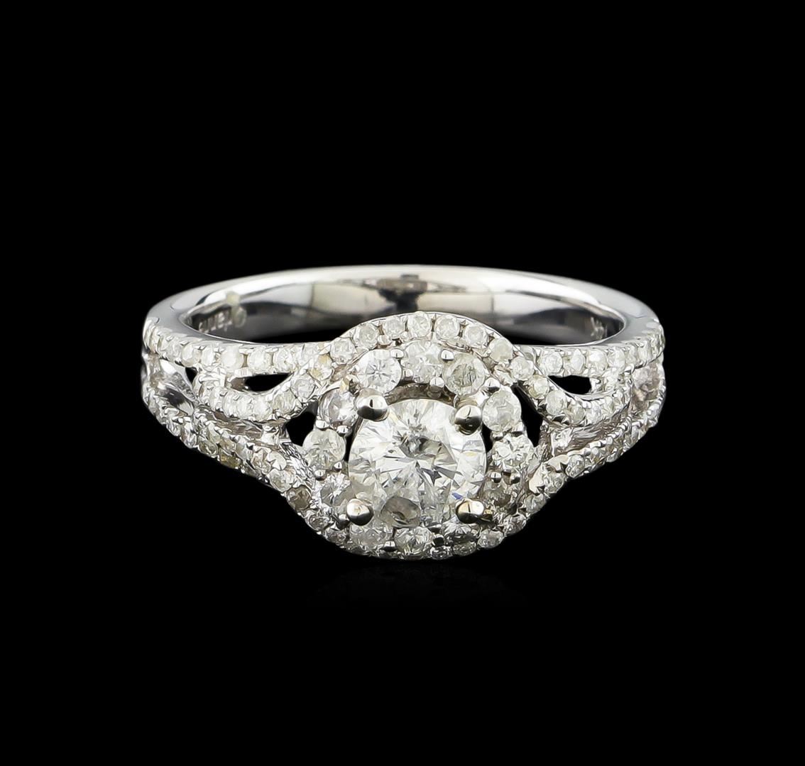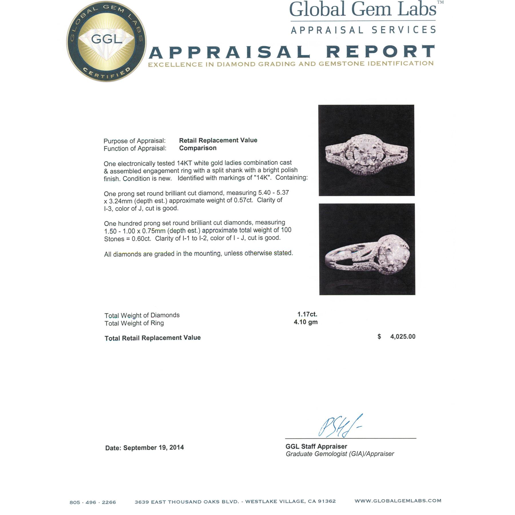 One electronically tested 14KT white gold ladies combination cast & assembled engagement ring with a split shank with a bright polish finish. Identified with markings of "14K". Condition is new. Containing: One prong set round brilliant cut diamond, measuring 5.40 - 5.37 x 3.24mm (depth est.) approximate weight of 0.57ct. Clarity: I-3. Color: J, Cut is Good. One Hundred prong set round brilliant cut diamonds, measuring 1.50 - 1.00 x 0.75mm (depth est.) approximate total weight of 100 Stones = 0.60 ct. Clarity: I-1 to I-2. Color: I - J, Cut is Good. All diamonds are graded in the mounting, unless otherwise stated. Total Weight of Diamonds 1.17ct. Total Weight of Ring 4.10 grams. GGL Appraised.