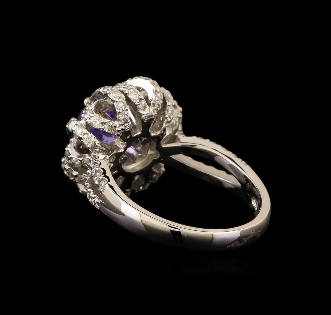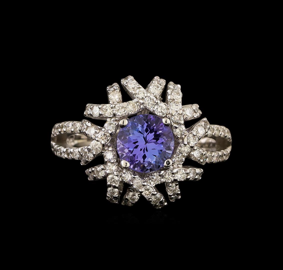 One electronically tested 14KT white gold ladies cast tanzanite and diamond ring with a bright polish finish. Identified with markings of "K14". Condition is new. Containing: One prong set round modified brilliant cut natural tanzanite, measuring 6.45 - 6.41 x 4.18 mm, approximate weight of 1.17ct., clarity is eye clean, type I, medium light, very slightly grayish, violet color, (GIA V 4/3), cut is good. Fifty-Six prong set round brilliant cut diamonds, measuring 1.30 - 1.30 x 0.78mm (depth est.) approximate total weight of 56 Stones = 0.45ct. Clarity: SI-2 to I-1. Color: H - I, Cut is Good. Colored gemstones are presumed to have been subjected to commonly used enhancement processes. All diamonds and colored gemstones are graded in the mounting, unless otherwise stated. Total Weight of Colored Stones 1.17ct. Total Weight of Diamonds 0.45ct. Total Weight of Ring 5.80 grams. GGL Appraised at $4,360.00.